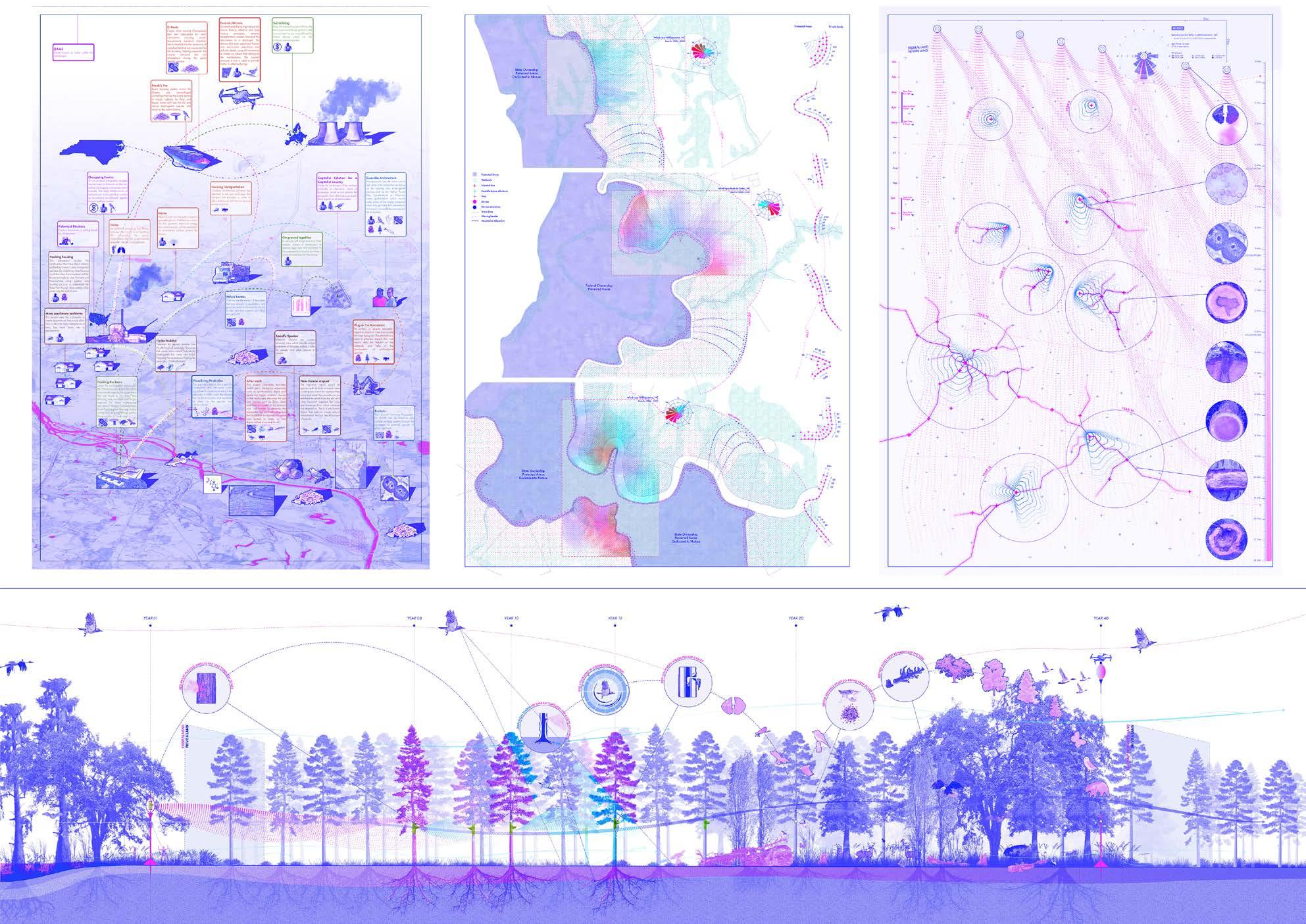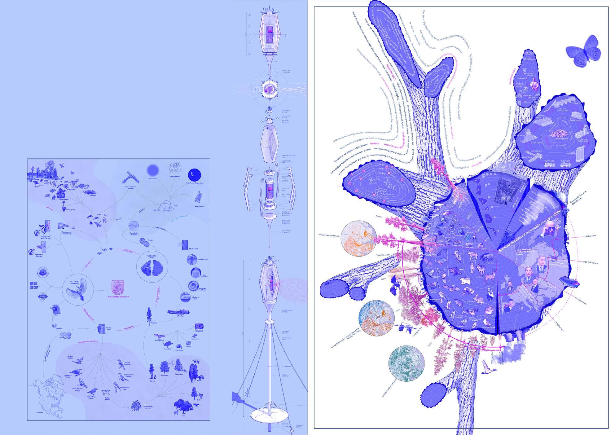The project aims to address the complex relationship between the ecosystem, humans, and non-humans, and to develop strategies to protect and restore the biodiversity of forests threatened by the extractive methods of the biomass industry in North Carolina. Through a series of drawings and diagrams, a guerilla landscape strategy is devised to spread the Red Heart Fungus across monoculture forests to initiate a network of human-nonhuman collaboration for invisible activism required to recover forests. The proposal includes a fungus spreading device programmed to follow wind patterns from federal to private land for effective action.