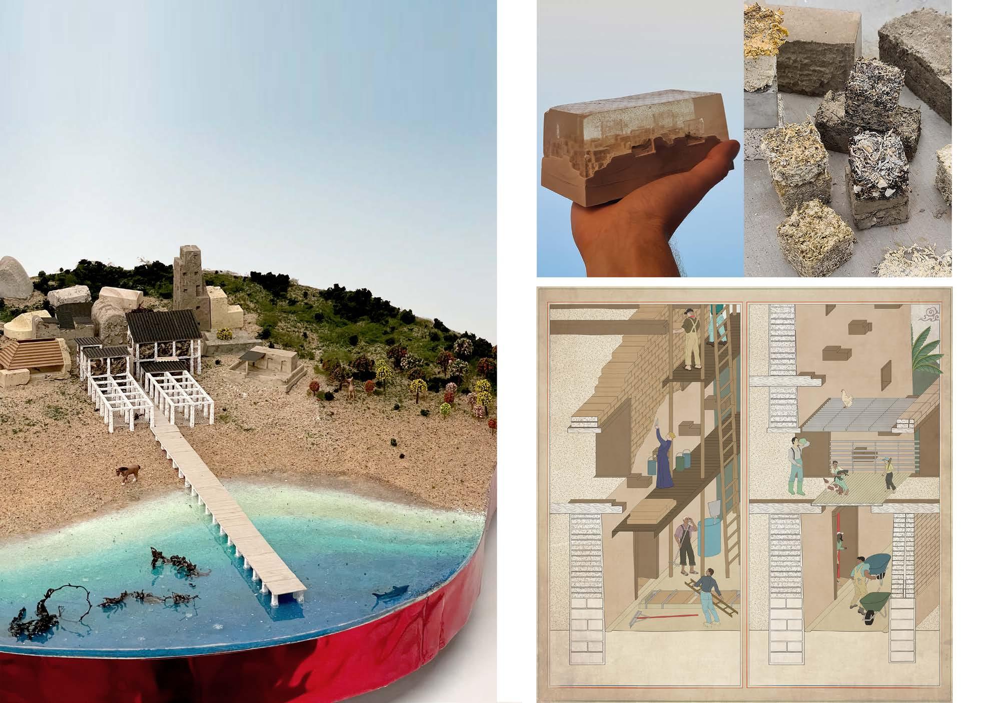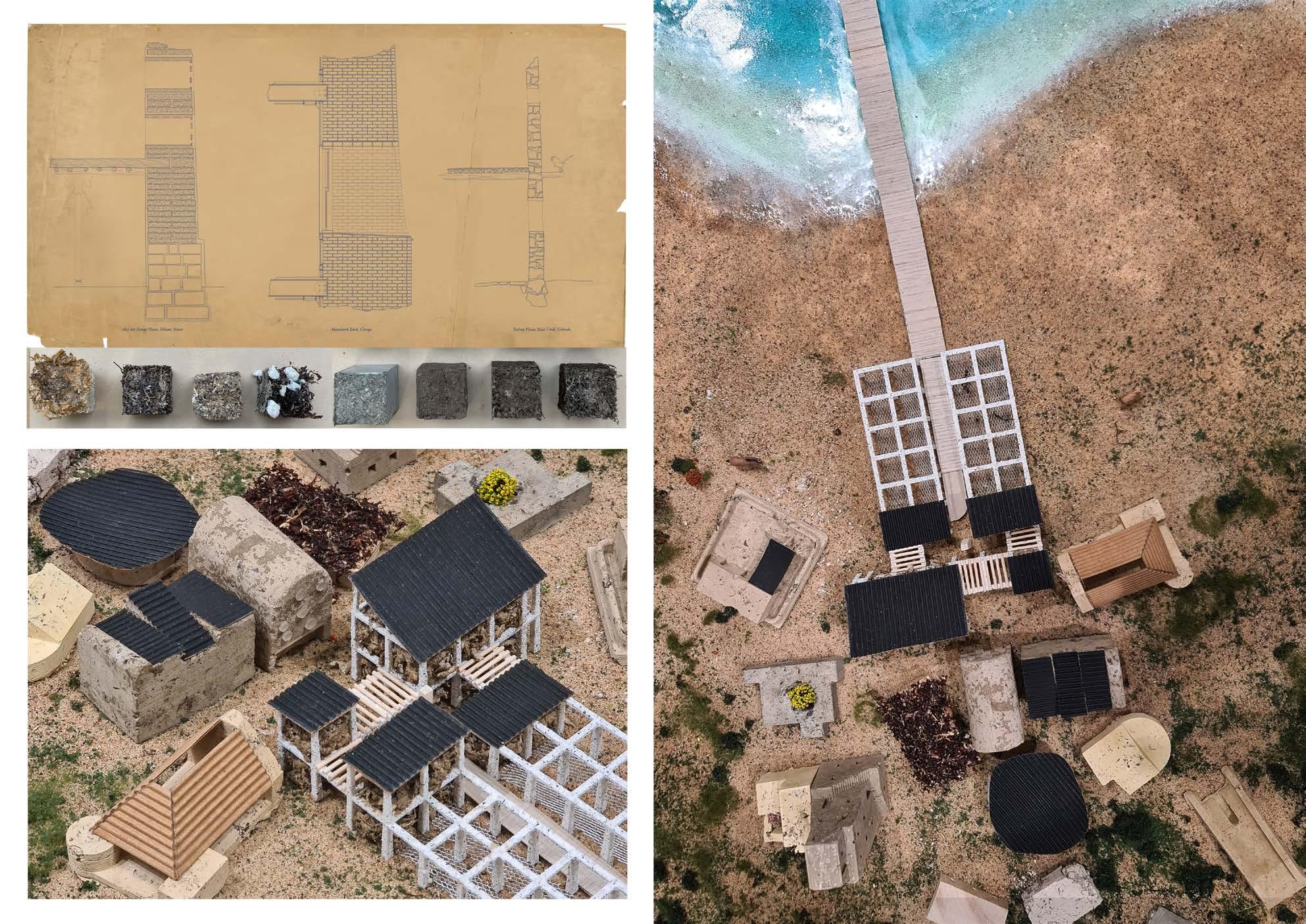 The studio project explores a new urban community deeply tied to Sargassum, a natural, carbon sequestering macro-algae that has grown uncontrollably in the Atlantic Ocean over the past decade. It is sourced before it reaches the Caribbean shores, after which it is processed to create raw material for construction blocks. The blocks offer low embodied carbon along with opportunities to experiment with load bearing masonry construction. After agreeing upon a localized building and ethical framework, members are given the freedom to build on their own, resulting in a ground up, iterative approach that can explore new ways of living in an eco-based urbanism.