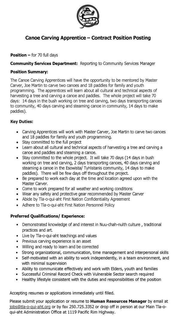 Need work experience? The Port Alberni Friendship Centre is looking for interested applicants for various positions. Call 250-723-8281