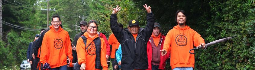 He couldn’t find his orange shirt for the annual Truth and Reconciliation Day Walk, but Tla-o-qui-aht gave him a new one, which he tucked in his jacket like a scarf.