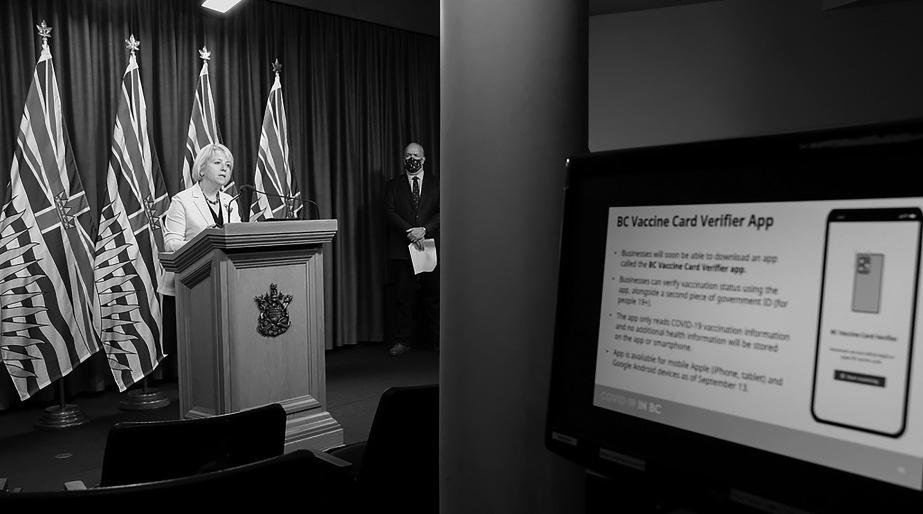 Photo by Don Craig/Province of B.C. photo With Premier John Horgan standing by, Dr. Bonny Henry, B.C.’s provincial health offi cer, gives information on the requirements for proof of COVID-19 vaccination on Sept. 7.