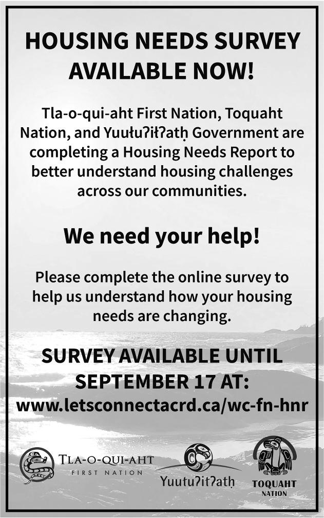 September 17, 2021 After that date, material submitted and judged appropriate cannot be guaranteed placement but, if material is still relevant, will be included in the following issue. In an ideal world, submissions would be typed rather than hand-written. Articles can be sent by e-mail to holly.stocking@nuuchahnulth.org (Windows PC). Submitted pictures must include a brief description of subject(s) and a return address. Pictures with no return address will remain on fi le. Allow two - four weeks for return. Photocopied or faxed photographs cannot be accepted.