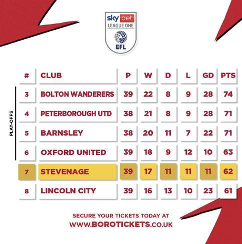 Match tickets are available online at www. borotickets.co.uk and from the Stevenage FC Club Shop until 2pm on Saturday 30th March and from the South Stand Ticket Office at The Valley.