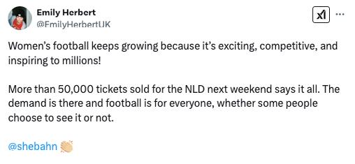 Nobody is trying to ban men’s football, nobody is trying to lessen it. I’m told people only go to women’s games because the ticket prices are so low, and that it’s more familyfriendly. Oh, and it only gets strong viewing figures because games are on TV.