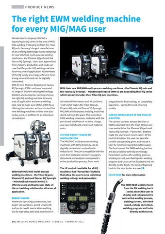preparation to final costing, all completely paperless – saving time and ensuring quality. MAKING WORK EASIER AT THE PUSH OF A BUTTON The control variants already familiar to EWM customers from the Titan XQ puls are now available for the Phoenix XQ puls and Taurus XQ Synergic. “Favourites” buttons make the user’s work much easier: At the push of a button, the user can save the current set operating point and reload it later by simply pressing the button again. The functions of the EWM welding torches are also available with XQ technology. Parameters such as the welding process, welding current, wire feed speed, welding program and tasks can be displayed and set directly on the torch. The days of traipsing back to the wire feeder are over! ■ CLICK HERE for more information