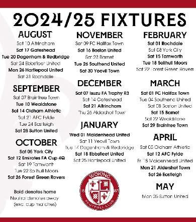 Please note fixtures are subject to availability, If you have any further questions or special requests email simon.jones@wokingfc.co.uk