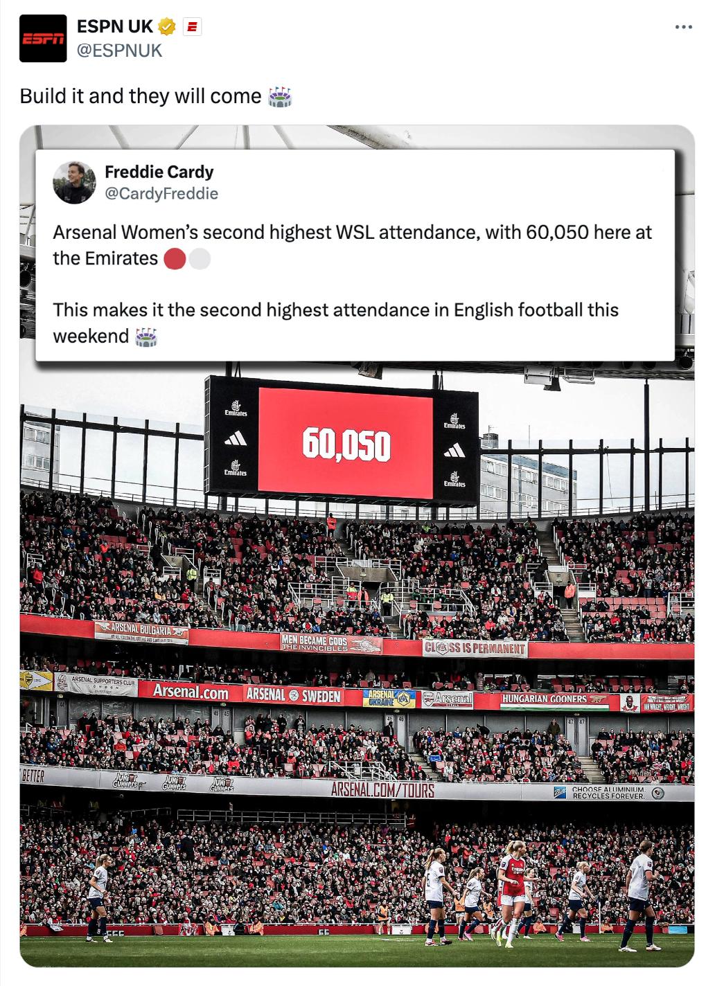 move to Emirates Stadium. Sharing the limelight with the men’s team no longer seems like a distant aspiration, and could potentially inspire other clubs to follow suit.
