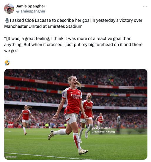 Victoria Pelova revealed to me that Cloé Lacasse’s ABBA-inspired chant is her personal favourite when I spoke to her in the mixed zone after Arsenal beat Leicester earlier this season- that was a fun chat. Speaking to Meg Lay for this particular fanzine was also really enjoyable.