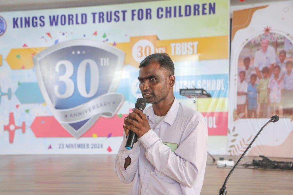 Mr Rajendra Singh, Trustee, Mrs Jeya Agnes Daniel Trustee – Director of Kings School were also present and made the day more special. Mr Micheal Prakash, ex- Manager was also present. More than 200 members were present in the A K Hall to celebrate this special occasion. All the old trust students reunion was the highlight of the day. Uncle Colin shared his experiences on how it all began and also shared a few special moments through these ages that he had come through. Further, Mr Navamani, Co-Founder and Correspondent of Kings School further shared in detail about the 30 years of Journey of KWTC through a power point presentation where each photos had so many things to say and share. The pictures bought the old memories back to all students and foster mothers. This was followed by a fold dance, Western dance where the students performed with full energy and adding to this, the choir team gave a wonderful song. Ex-students –Charles, Venkatesh came forward to say about how they could support the students in addition to sharing their days at KWTC. Every individual student had so much to share and all were grateful to what they are today and how KWTC has changed their life to make them physiotherapists, Nursing Sisters, Teachers, Captain, Entrepreneurship, and much more.