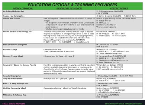 Tertiary training institution offering a broad range of applied degrees and diplomas in a range of topic areas as well as trade training courses and adult literacy and numeracy programmes. Some courses are located in Flaxmere and attract no fees: Flaxmere Shopping Centre, Swansea Rd, FLAXMERE P: 06 974 8943 F: 06 8796844 E: tkupa@eit.ac.nz