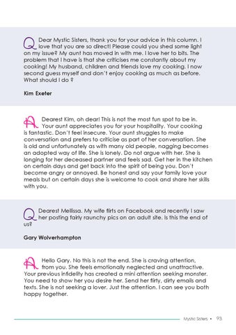 Dear Mystic Sisters, thank you for your advice in this column. I love that you are so direct! Please could you shed some light on my issue? My aunt has moved in with me. I love her to bits. The problem that I have is that she criticises me constantly about my cooking! My husband, children and friends love my cooking. I now second guess myself and don’t enjoy cooking as much as before. What should I do ? Kim Exeter