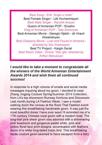 I would like to take a moment to congratulate all the winners of the World Armenian Entertainment Awards 2014 and wish them all continued success! In response to a high volume of emails and social media messages inquiring about my gown, I decided to wear Zhang Jingjing Couture Spring/Summer 2014 Collection, from LA’s top showroom Runway Archives and Showroom. Last month,during LA Fashion Week, I saw a model walking down the runway at the Rock That Fashion event wearing this breathtaking handmade gown. It was just the most beautiful dress I have ever seen! It reminded me of a 17th century Chinese royal gown with a modern twist. The long-trail pink sheer gown was adorned with a shimmering pink beadwork and gorgeous pastel white, pink and yellow floral lace print designs, accentuated with feathers decor of a white long-tailed tropic bird. This breathtaking haute couture gown seemed to have escaped from a fairy