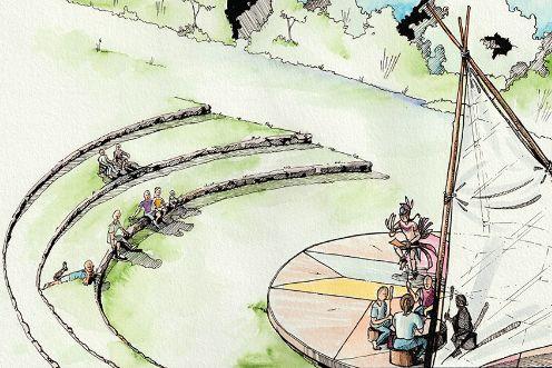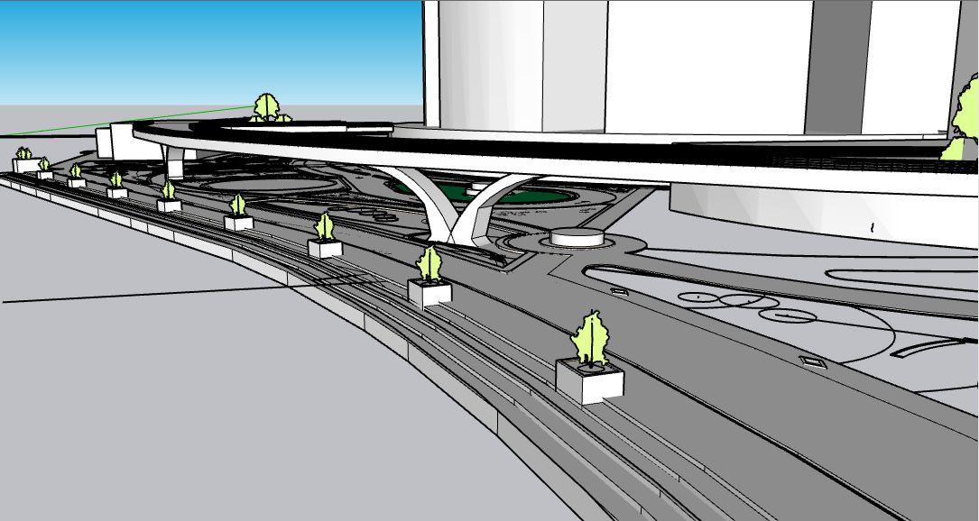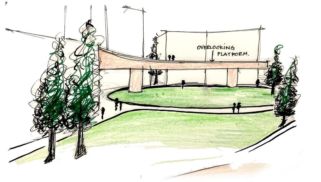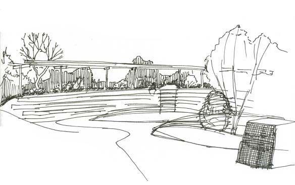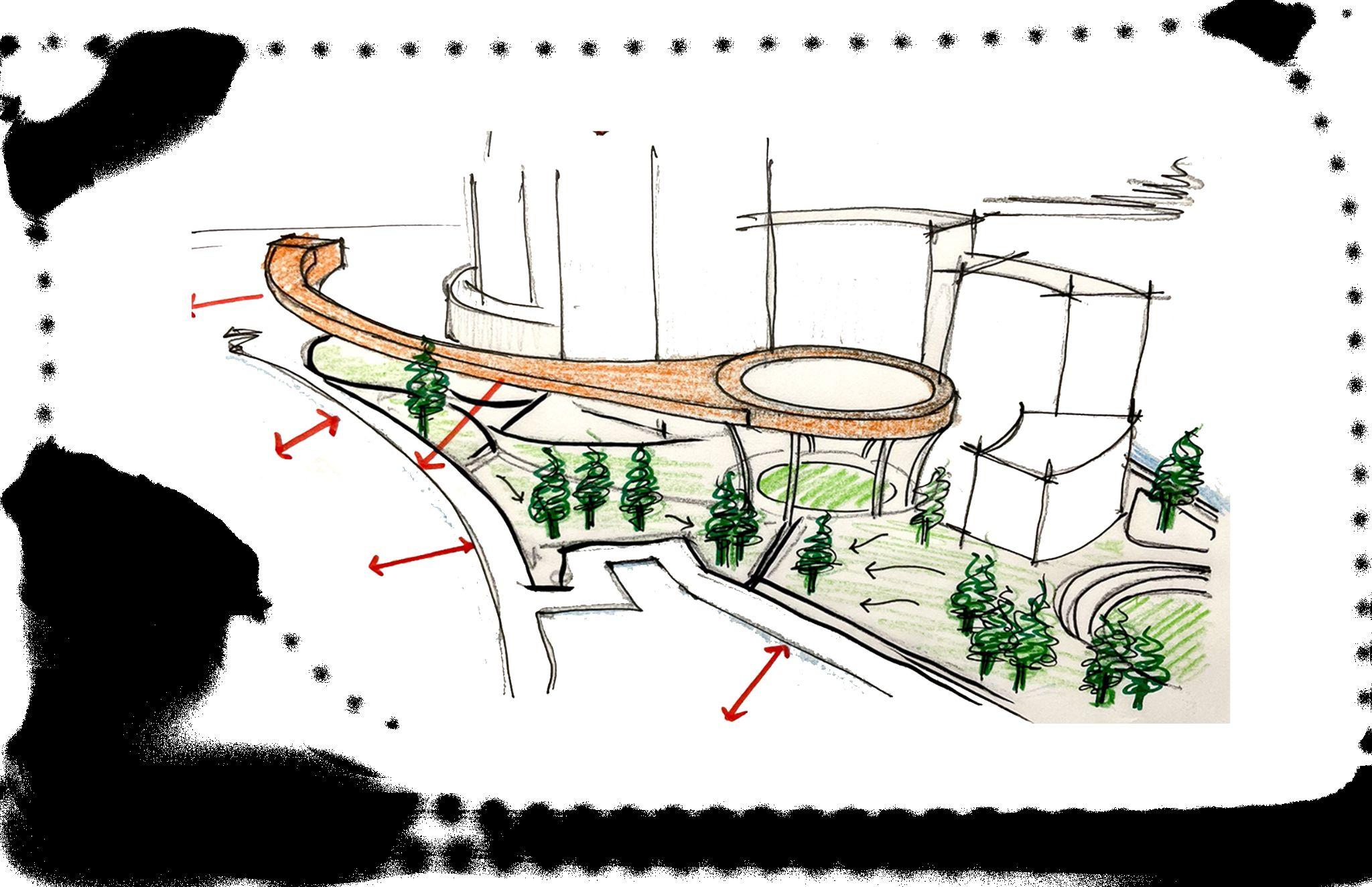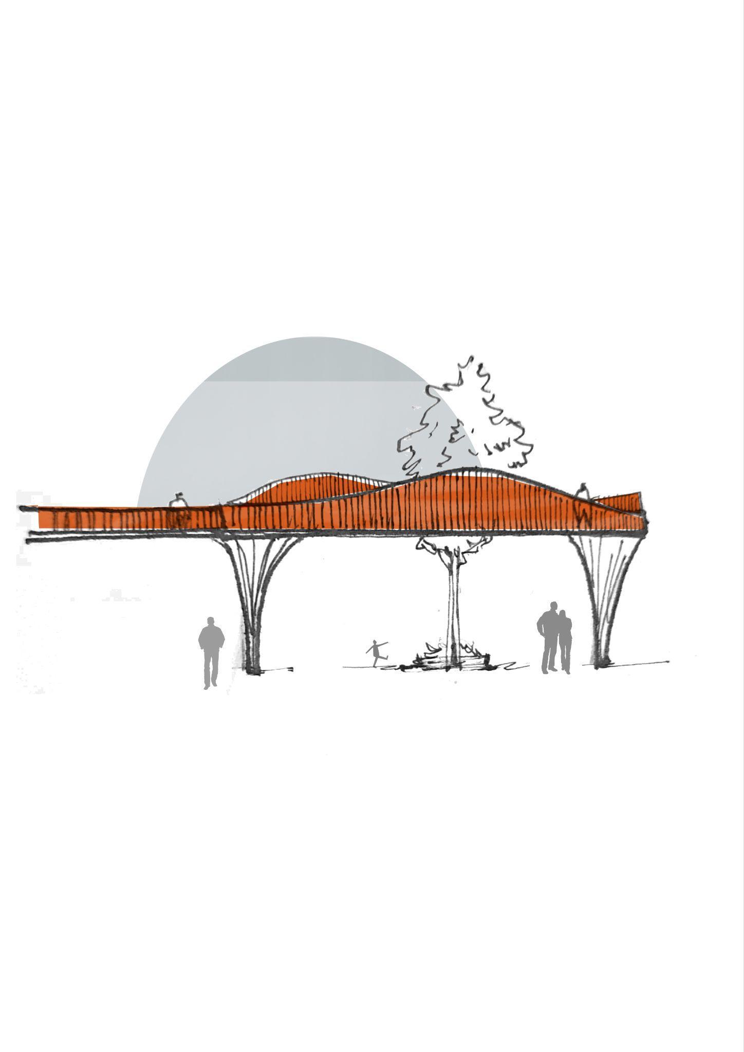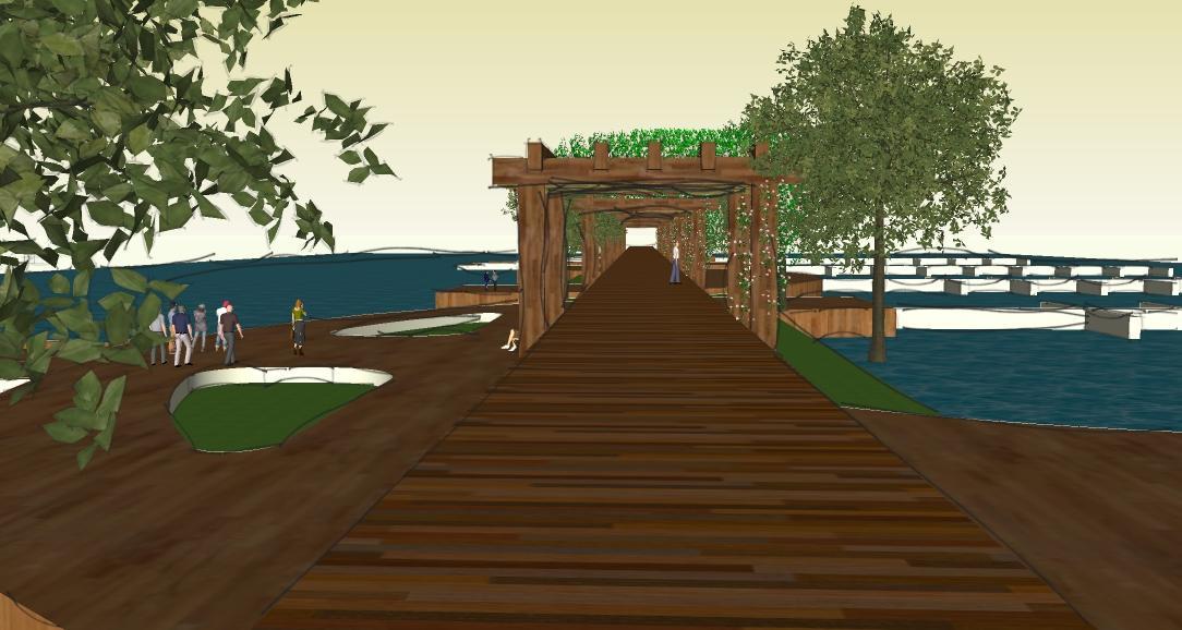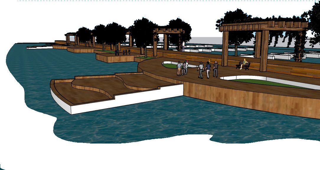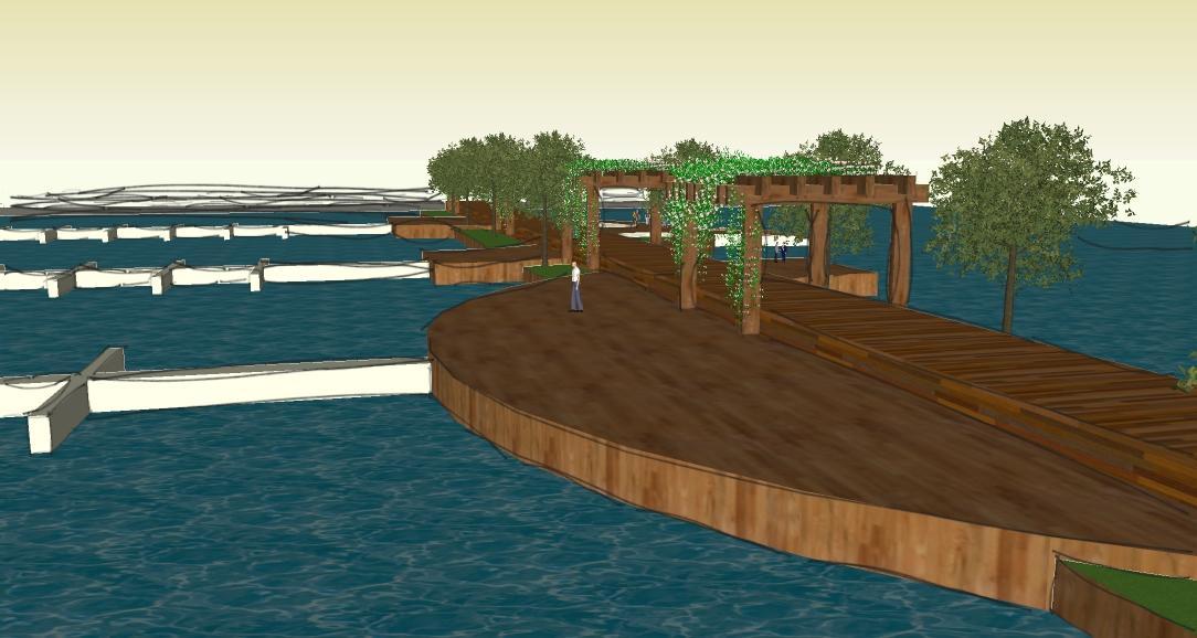 A series of extensions of walkway connecting wooden decks with benches and pergolas. The walkways leading to the decks are painted with sidewalk art using calming and interactive colors to distinguish-mark each sitting zone. The designs will echo environment messages. The decks are facing different views and are situated to provide privacy and inclusion to all ages. The walkway leading to the decks shall be at ground level, and leveled with the decks to prevent any climbing gesture for elder or younger visitors of location. The deck will be designed carefully to echo the sites designs. The decks will include suitable landscaping to further beautify the deck and enhance the public experience.