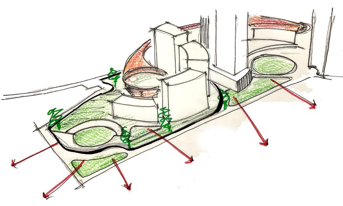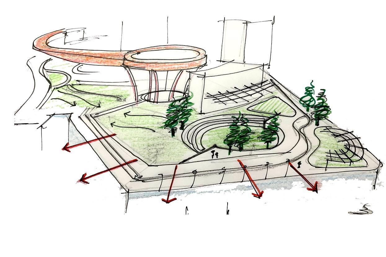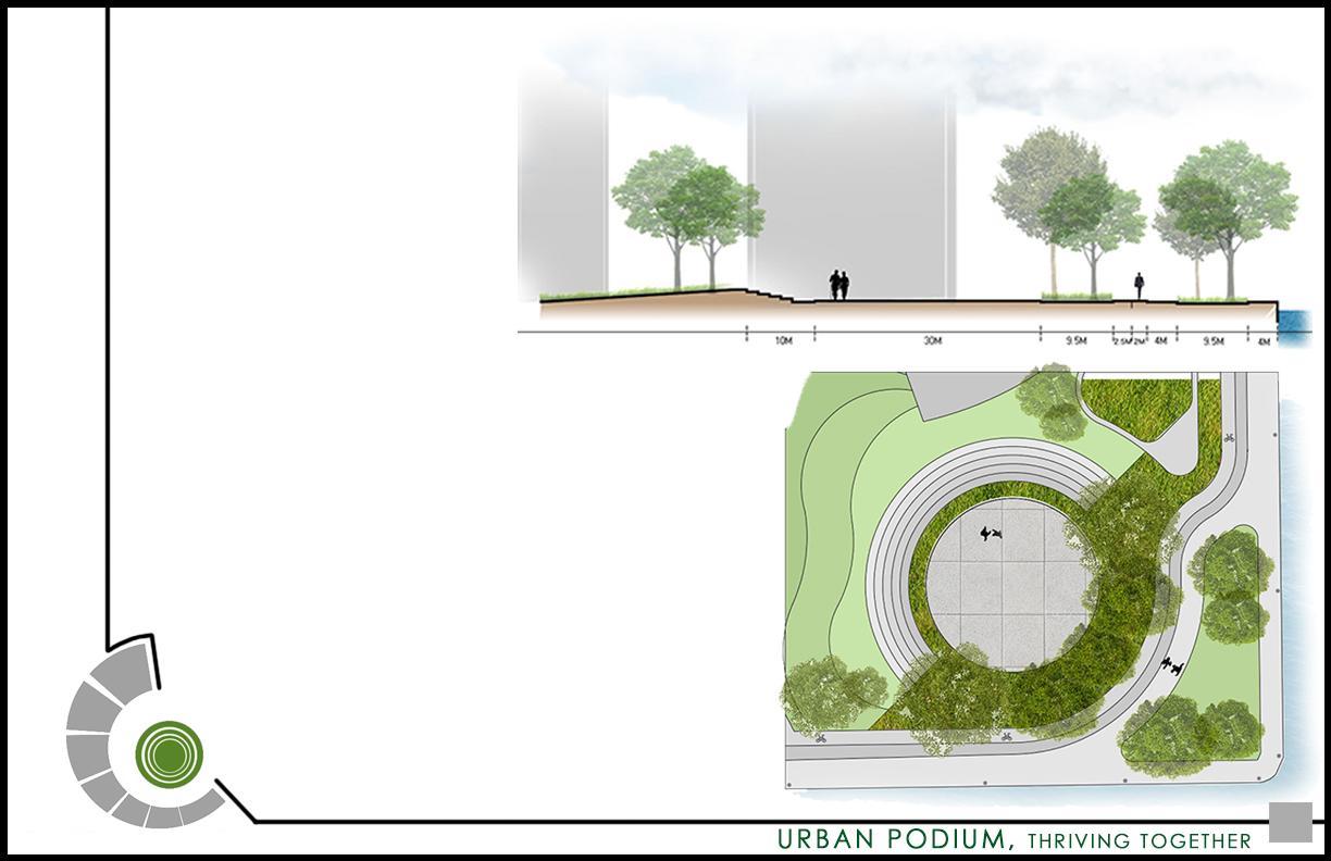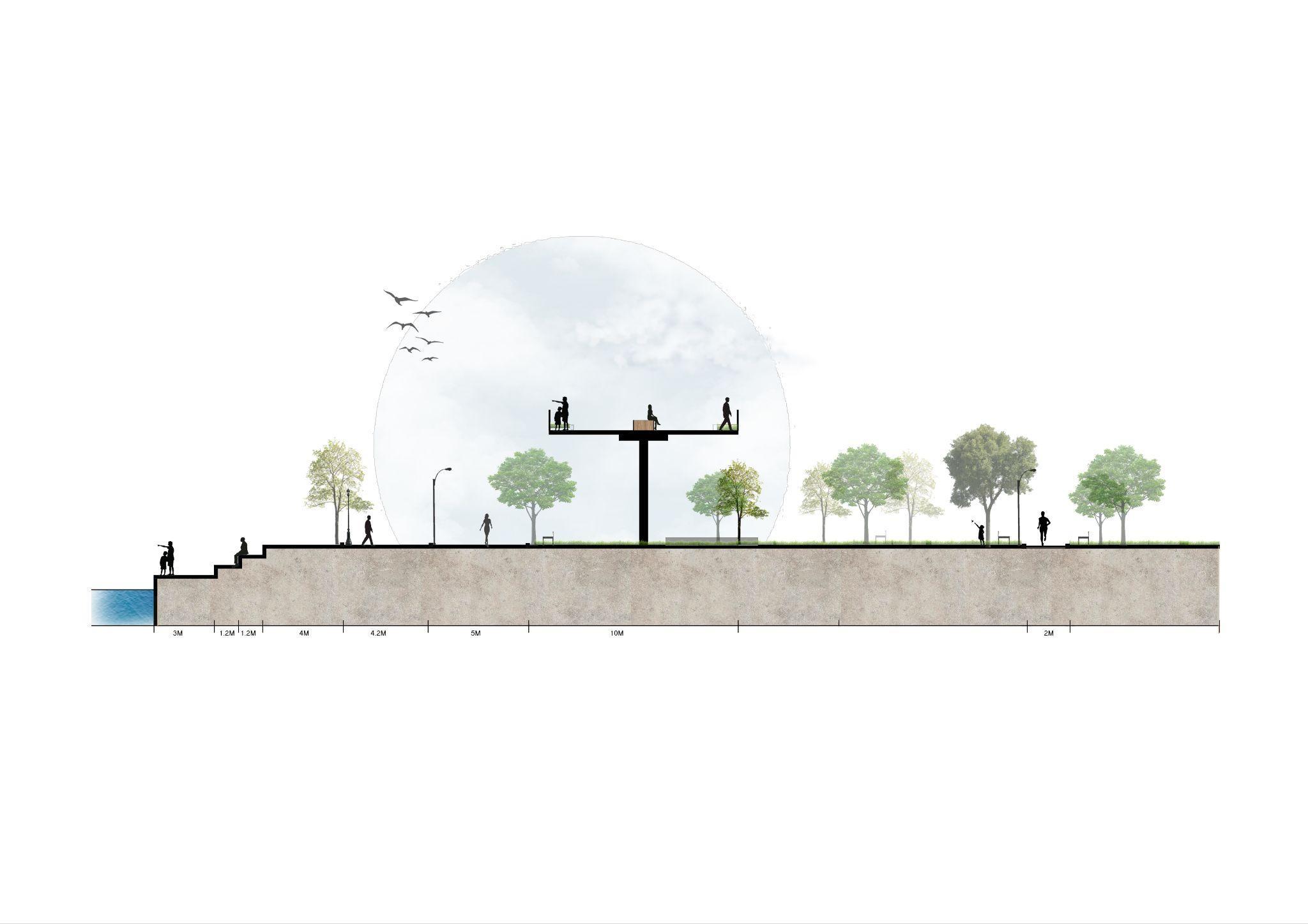 The bottom most part of the site is mainly designed to benefit the maximum view of the surrounding context. Space is designed to have public sitting and viewing area.