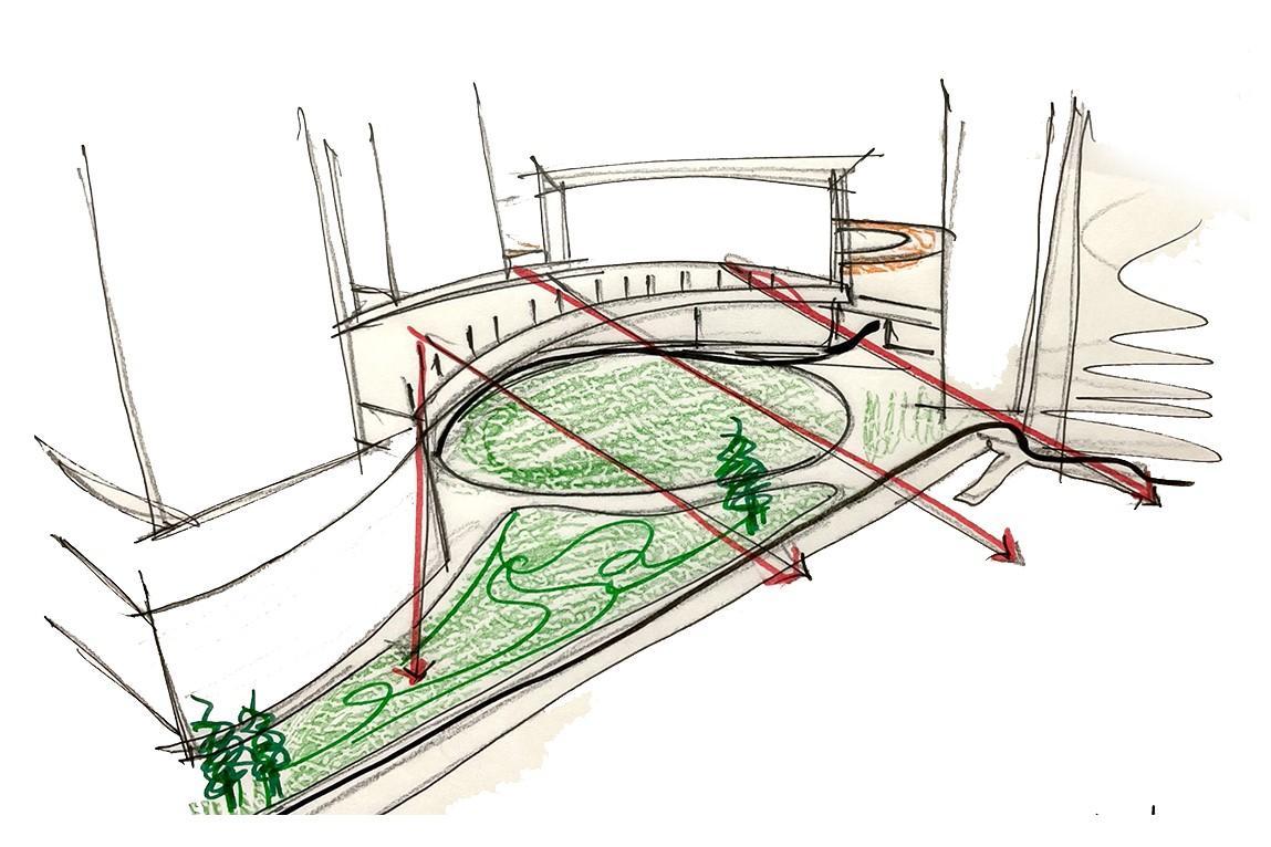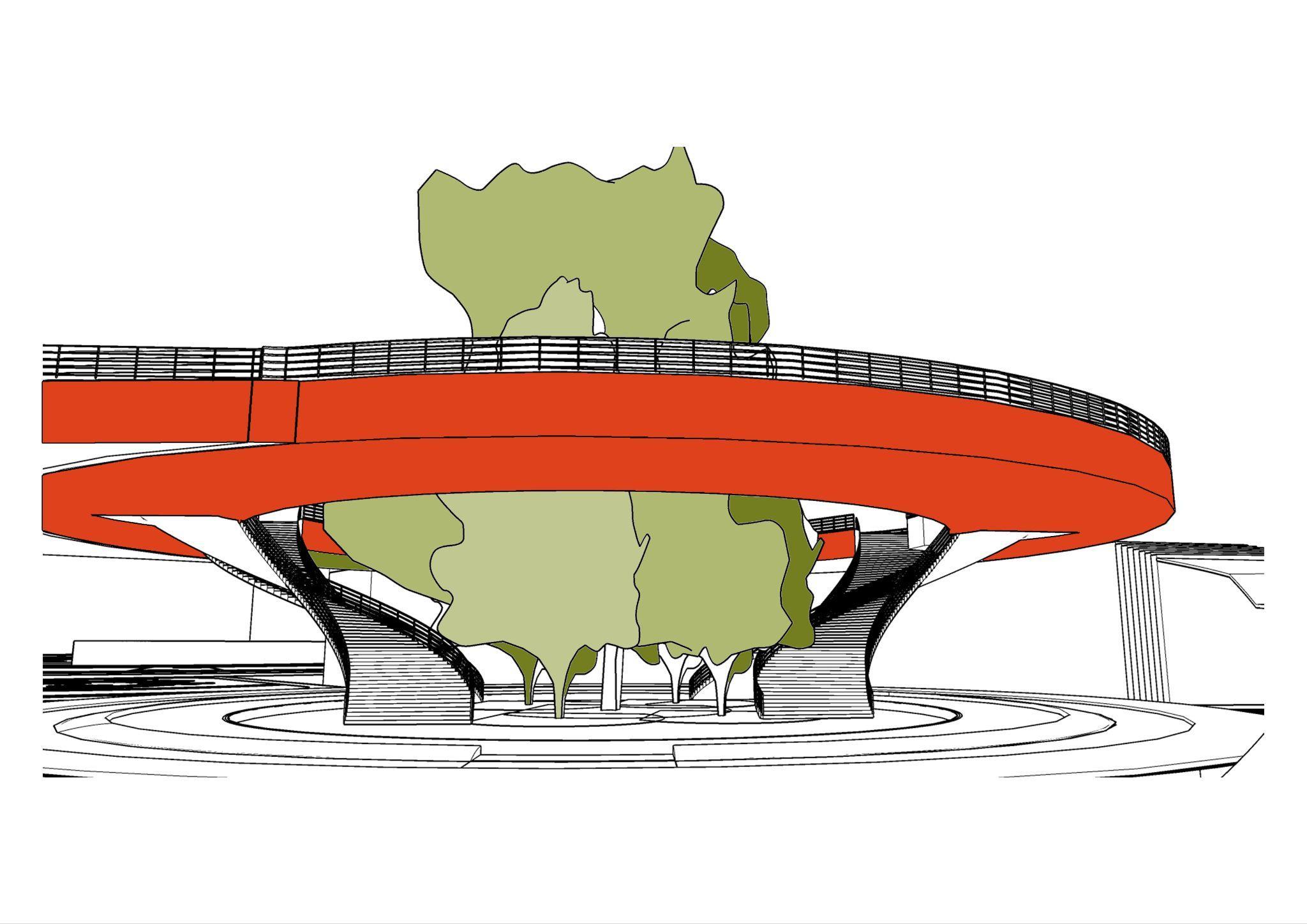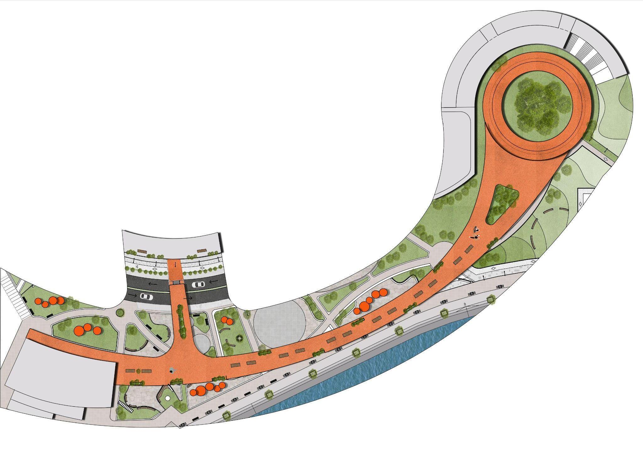The curved bridge offers stunning views of the water and lush greenery. This elevated path connects people seamlessly from the built form's podium to the open spaces. Thoughtfully designed furniture and green patches enhance the pathway without obstructing views. The vibrant brick red color stands out, attracting people and serving as a communal space with nodes at every point. Rubber flooring ensures accessibility and efficiency in all weather conditions.