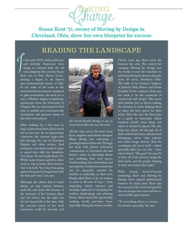 n the early 1970s, while politicians and everyday Americans were trying to contend with the oil crisis plaguing the country, Susan Kent was in New Haven, Conn., earning a degree in art history and environmental science at Yale. In the wake of the crisis as the environmental movement continued to gain momentum, she went on to earn a Master’s degree in landscape architecture from the University of Virginia. She was determined to find ways to artfully and conscientiously incorporate and preserve nature in the built environment. After working for a few years in large architectural firms, Kent struck out on her own. As an independent contractor, she oversaw large-scale jobs through the city of Cleveland Heights and other entities. And setting her own hours made it easier to spend time with her daughters, Tori Kauer ’04 and Lydia Kauer ’07. While many women opted to either work or stay at home, Kent found a way to do both. “In a way, I was going against the grain by being home with the kids part-time,” she says. Although she admits that it wasn’t always an easy balance between work life and home life because of the demands of her business, Kent says the choice was the right one for her household at the time. Still, the seasonal nature of her work sometimes could be stressful, and