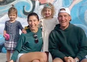Sarah Shemory Zimmer ’05 with her husband, Sam, Goldie (3) and Matilda (2) in Florida for winter break in 2024.