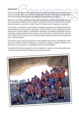 CRECEMOS Para un desarrollo óptimo del proyecto scout son necesarios elementos dentro de los grupos scouts, uno de los cuales es el número de responsables adultos, su formación y compromiso, y el otro tiene que ver con el número de beneficiarios que asisten a las reuniones. Desde hace varios años venimos desarrollando actividades que aborden el crecimiento en el número de beneficiarios dentro de los grupos, analizando los centros de interés de las distintas franjas de edad en sus entornos sociales. Estas se concretan como “campañas de captación”. Por otro lado, y atendiendo a las prioridades estratégicas propuestas por la Organización Mundial del Movimiento Scout, hemos comenzado a tomar conciencia de la importancia del crecimiento de los recursos adultos, manteniendo y formando a los actuales responsables scouts y atrayendo a antiguos miembros de los grupos y de la Asociación a la dinámica activa. Este proceso se dilatará en el tiempo ya que es necesario generar dinámicas y foros de participación de estos “recursos adultos”. Fruto de esta nueva línea de actuación es la cena celebrada dentro de las actividades del centenario del escultismo, donde conseguimos la asistencia de algunos antiguos miembros de la Asociación, y las invitaciones a la actividad de la Luz de la Paz de Belén. El resultado de las líneas propuestas se verá a medio plazo, aunque se van produciendo acercamientos que esperemos que se refuercen en los próximos meses.