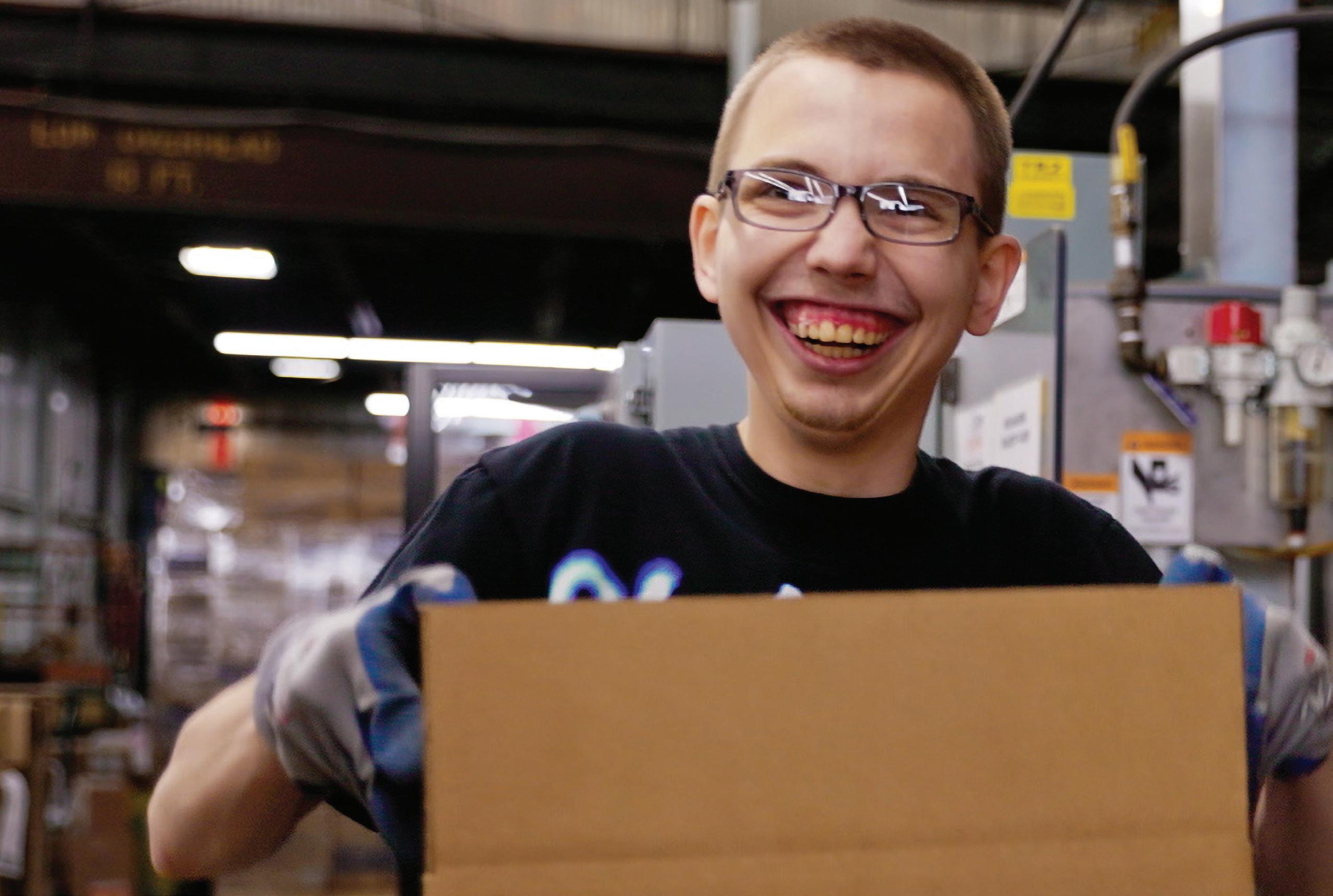Kurtis Holcomb pauses to share a smile as he assembles shipping boxes during his shift at Essendant.