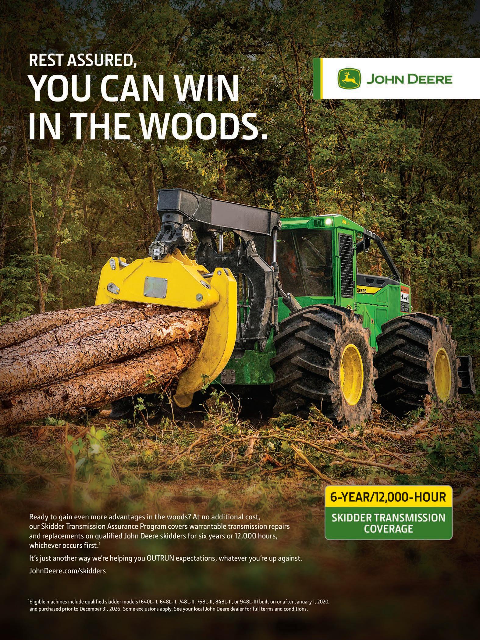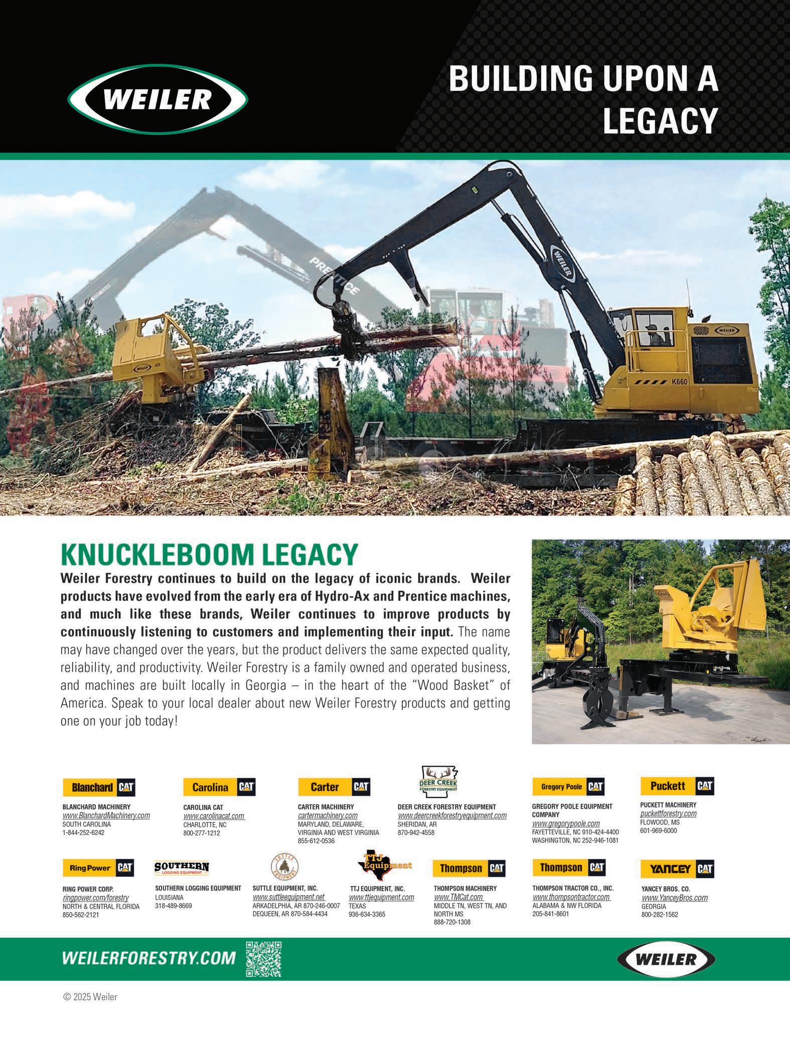 Weiler’s 7,500-hour, fouryear warranty on woods equipment speaks for itself and was a no-brainer for Mullis. “You get an extra year and 1,500 hours,” he says. “If you run it longer you have more equity when you trade it to keep payments down. The cost of these machines goes up 3% per year, (so) you need those type of advantages to keep your payments from jumping each year when the pay doesn’t jump.” Mullis Logging deals with Yancey Bros., Waycross, for everything Weiler. Meanwhile, Dobbs Equipment, Brunswick, serves all of Mullis Logging’s John Deere needs. “I like John Deere but there’s only so much difference in tractor brands,” the logger asserts. “The difference lies in the people you deal with.” Mullis deals primarily with longtime territory manager Jimmy Lydon. “Jimmy is willing to help, and financing is easier to deal with one guy. I trust him.”