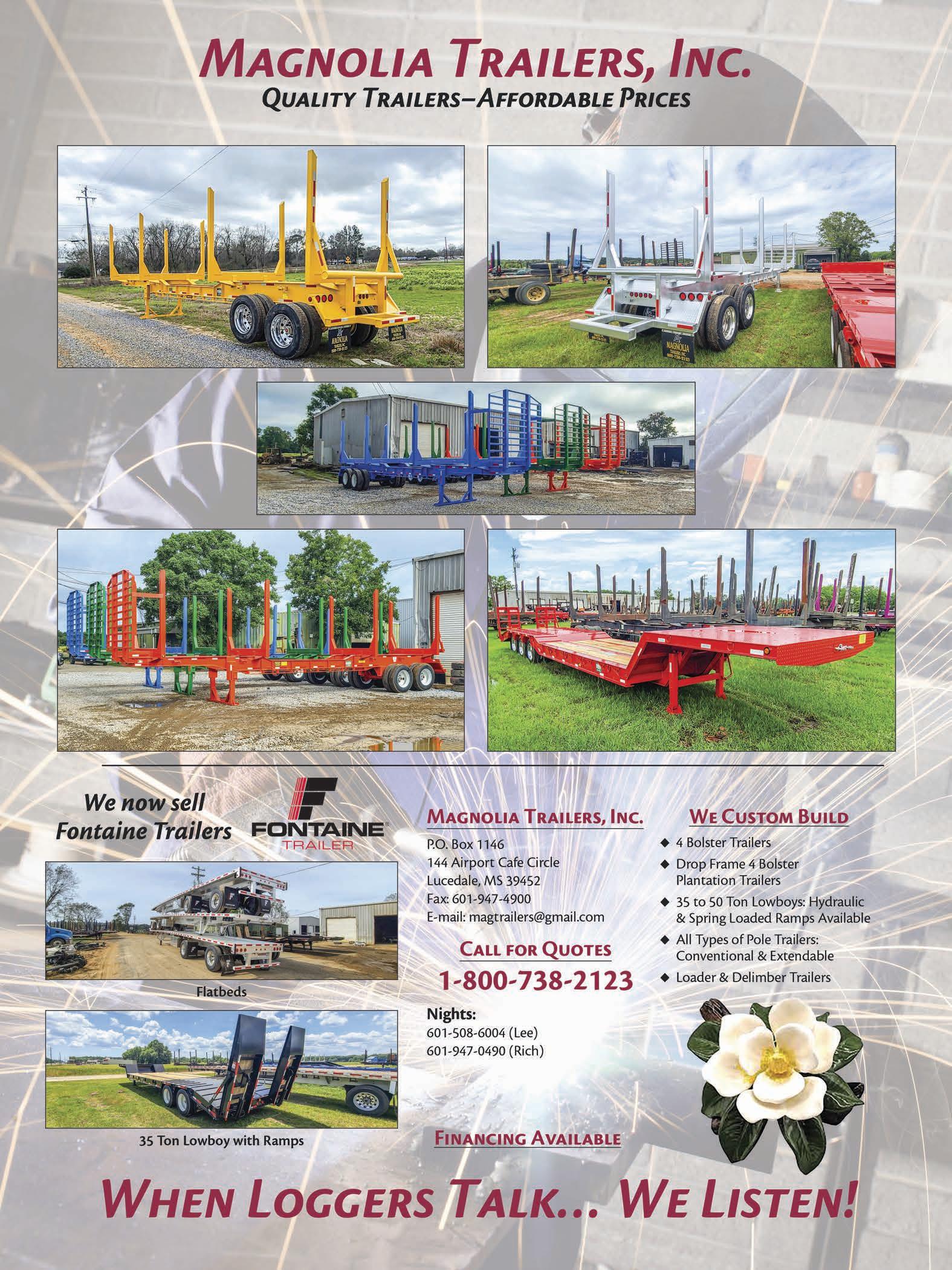 Mullis Logging boasts a mix of 25 Magnolias and Country Boy trailers, favoring air-ride and single-point suspension setups for easier inspections and smoother hauls.