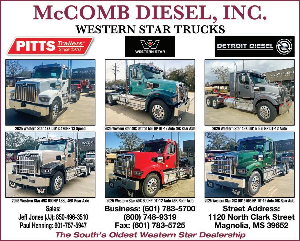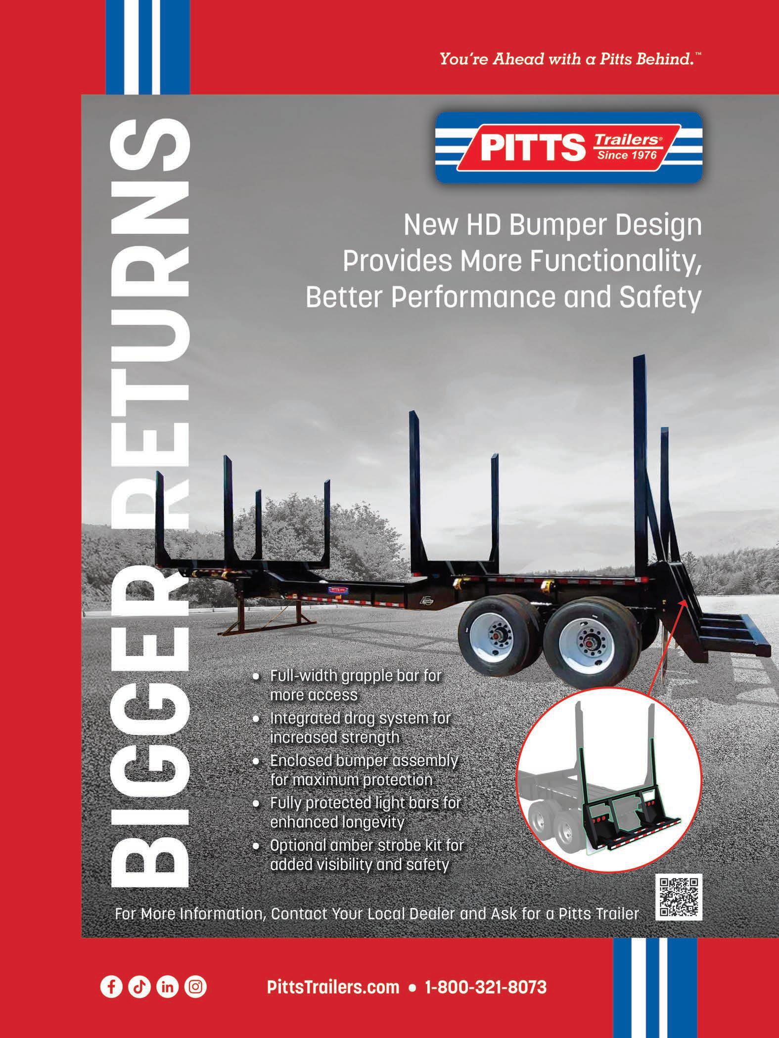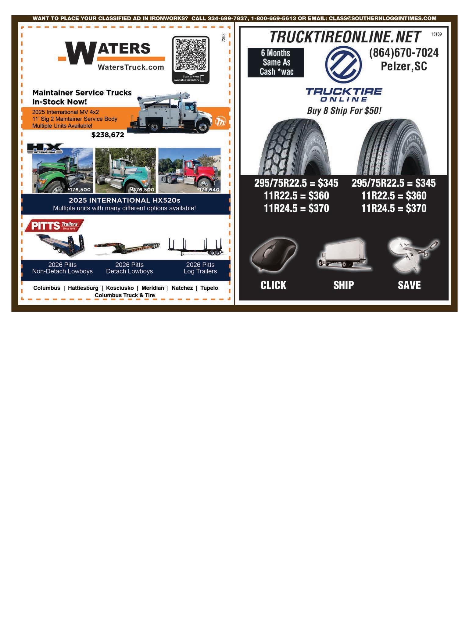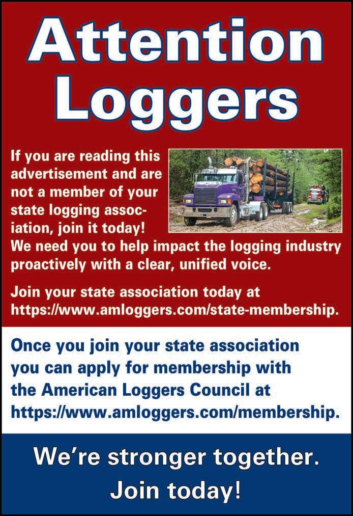 Subscription Information—SLT is sent free to logging, pulpwood and chipping contractors and their supervisors; managers and supervisors of corporate-owned harvesting operations; wood suppliers; timber buyers; wood procurement and land management officials; industrial forestry purchasing agents; wholesale and retail forest equipment representatives and forest/logging association personnel in the U.S. South. See form elsewhere in this issue. All non-qualified U.S. subscriptions are $65 annually; $75 in Canada; $120 (Airmail) in all other countries (U.S. funds). Single copies, $5 each; special issues, $20 (U.S. funds). Subscription Inquiries TOLL-FREE 800-669-5613; Fax 888-611-4525. Go to www.southernloggintimes.com and click on the subscribe button to subscribe/renew via the web. All advertisements for Southern Loggin’ Times magazine are accepted and published by Hatton-Brown Publishers, Inc. with the understanding that the advertiser and/or advertising agency are authorized to publish the entire contents and subject matter thereof. The advertiser and/or advertising agency will defend, indemnify and hold Hatton-Brown Publishers, Inc. harmless from and against any loss, expenses, or other liability resulting from any claims or lawsuits for libel violations or right of privacy or publicity, plagiarism, copyright or trademark infringement and any other claims or lawsuits that may arise out of publication of such advertisement.