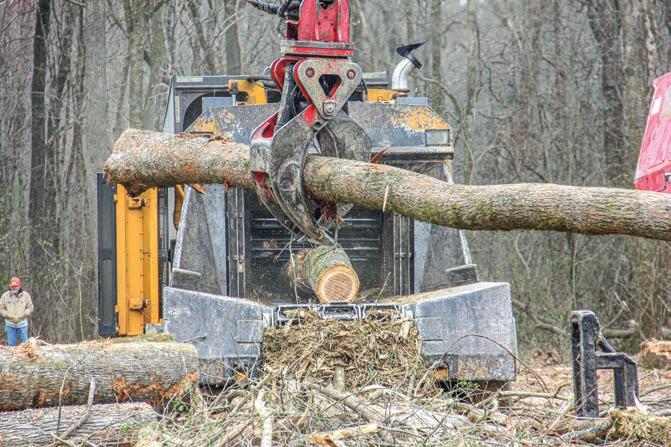 A John Deere 643L-III cutter with FD45 felling head was targeting 30year-old loblolly pines, 25 ft. long with 5 in. tops for chip-n-saw. Mullis has tested several of Deere’s felling heads and prefers the standard model. “A lot of people like to run