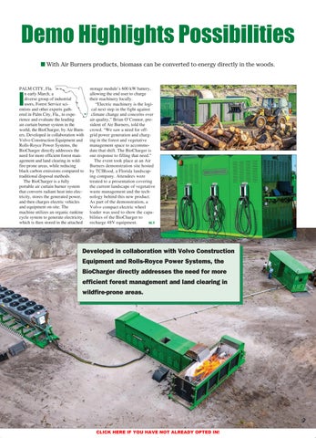 In early March, a diverse group of industrial users, Forest Service scientists and other experts gathered in Palm City, Fla., to experience and evaluate the leading air curtain burner system in the world, the BioCharger, by Air Burners. Developed in collaboration with Volvo Construction Equipment and Rolls-Royce Power Systems, the BioCharger directly addresses the need for more efficient forest management and land clearing in wildfire-prone areas, while reducing black carbon emissions compared to traditional disposal methods.