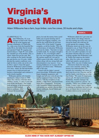 Virginia’s Busiest Man Adam Wilbourne has a farm, buys timber, runs five crews, 20 trucks and chips. JESSICAJohnson CLARKSVILLE, Va. dam Wilbourne, 42, is no stranger to hard work. Growing up in the logging and farming community of Clarksville, Va., steps away from the beautiful Roanoke River, his father David owned and operated Triple W Logging and farmed tobacco. Triple W, now under the watchful eye of his brother, Dan, is where Adam first got his start. But, after working for the family through ups and downs over 16 years, Adam decided the market conditions were right for him to strike out on his own in 2012—and it’s been full speed ahead for Wilbourne Land & Timber ever since. Adam, his dad and brother remain close in both personal and business relationships and continue to work closely together. Wilbourne and his wife Jennifer purchased a tobacco farm in 1999, where they still live with their three children, Austin, 17, and 13-year-old twins Kade and Kinley. The couple took advantage of the government’s buyout in 2004 leading them to soybeans. After soybeans hit record high