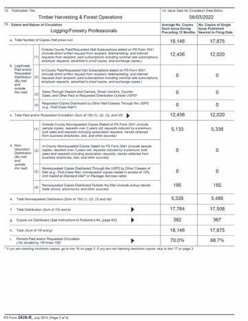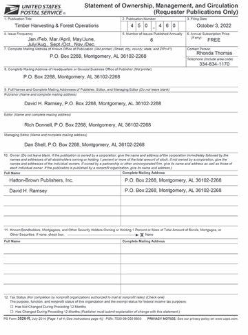 Timber Harvesting & Forest Operations (ISSN 2154-2333) is published 6 times annually (January/February, March/April, May/June, July/August, September/October, November/ December issues are combined) by Hatton-Brown Publishers, Inc., 225 Hanrick St., Montgomery, AL 36104. Subscriptions are free to U.S. logging, pulpwood and chipping contractors and their supervisors; managers and supervisors of corporate-owned harvesting operations; wood suppliers; timber buyers; businesses involved in land grooming and/or land clearing, wood refuse grinding and right-of-way maintenance; wood procurement and land management officials; industrial forestry purchasing agents; wholesale and retail forest equipment representatives and forest/logging association personnel. All non-qualified U.S. subscriptions are $50 annually; $60 in Canada; $95 (airmail) in all other countries (U.S. funds). Single copies, $5 each; special issues, $20 (U.S. funds).