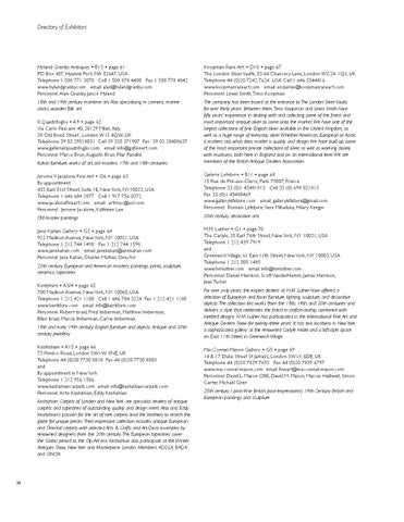 20th century European and American masters: paintings, prints, sculpture, ceramics, tapestries. Kentshire • A3/4 • page 65 700 Madison Avenue, New York, NY 10065, USA Telephone 1 212 421 1100 Cell 1 646 704 3224 Fax 1 212 421 1180 www.kentshire.com email: info@kentshire.com Personnel: Robert Israel, Fred Imberman, Matthew Imberman, Ellen Israel, Marcie Imberman, Carrie Imberman 18th and early 19th century English furniture and objects. Antique and 20th century jewellery Keshishian • A15 • page 66 73 Pimlico Road, London SW1W 8NE, UK Telephone 44 (0)20 7730 8810 Fax 44 (0)20 7730 8803 and By appointment in New York Telephone 1 212 956 1586 www.keshishiancarpets.com email: info@keshishiancarpets.com Personnel: Arto Keshishian, Eddy Keshishian Keshishian Carpets of London and New York are specialist dealers of antique carpets and tapestries of outstanding quality and design merit. Arto and Eddy Keshishian’s passion for the art of rare carpets lead the brothers to search the globe for unique pieces. Their impressive collection includes antique European and Oriental carpets with selected Arts & Crafts and Art-Deco examples by renowned designers from the 20th century. The European tapestries cover the Gothic period to the Op-Art era. Keshishian also participate at the Winter Antiques Show, New York and Masterpiece London. Members: ADDLA, BADA and CINOA.