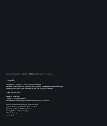 1. Auflage: 2010 Bibliografische Information der Deutschen Nationalbibliothek Die Deutsche Nationalbibliothek verzeichnet diese Publikation in der Deutschen Nationalbibliografie; detaillierte bibliografische Daten sind im Internet über http://dnb.d-nb.de abrufbar. ISBN 978-3-258-07616-4 Alle Rechte vorbehalten. Copyright © 2010 by Haupt Berne Jede Art der Vervielfältigung ohne Genehmigung des Verlages ist unzulässig. Gestaltung und Satz: Oliver Slappnig, Herrenschwanden Englische Übersetzung: J. Roderick O’Donovan, Wien Druckvorstufe: Lithwork AG, Niederwangen Umschlagbild: Croci & du Fresne, Ittigen Printed in Germany www.haupt.ch