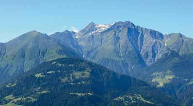 Abb. 1-7 A Blick nach N E auf den Grand Muveran, die Diablerets und das Wildhorn. Foto © Michaela Ustaszewski. Unter dem Gipfel der L’Argentine zeichnet sich im Gelände eine Falte ab. Zwei helle Kalkbänder, getrennt durch ein Grasband, biegen um fast 180° um. Das Grasband wird von der Kieselkalk-Formation (Alter: 130 Mio. Jahre), das obere Kalkband von der Schrattenkalk-Formation (Alter: 127 Mio. Jahre) gebildet. Bei genauerer Betrachtung erkennt man, dass das helle Band der Schrattenkalk-Formation tiefer unten im Wald nochmals zwei größere Falten bildet. In der Flanke des Grand Muveran bilden helle Kalke im oberen Teil drei hohe Felswände. Am Fuß der Flanke zeigen unterschiedlich gefärbte Schichten deren Verlauf parallel zum Hangfuß.