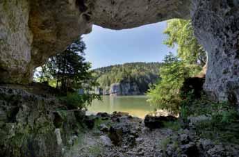 En haut : Débouchant à fleur du lac des Brenets, élargissement du Doubs, la Grotte de la Toffière (NE) n’est explorable qu’en périodes de très basses eaux. On y a trouvé de nombreux vestiges d’Ours des cavernes