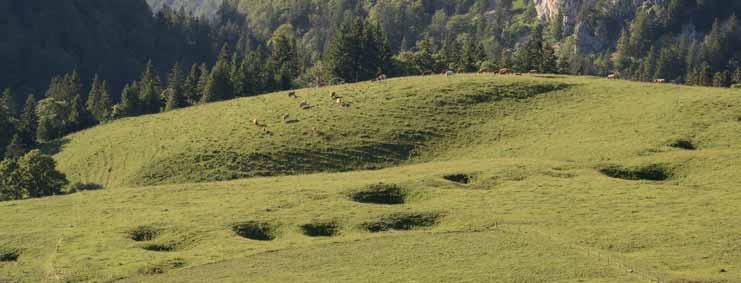 Ces objets ont été observés et étudiés en détail de sorte que l’on comprend aujourd’hui relativement bien les différents processus qui aboutissent à leur formation (voir illustration). Bien que caractéristiques des régions karstiques, une menace plane sur les dolines, qui font l’objet de pollutions, voire de comblements. Ces pratiques posent problème à plusieurs égards. En tant que point d’infiltration privilégié des eaux de surface, toute intervention sur une doline va avoir un impact sur l’ensemble du système karstique. Un agent polluant aboutira rapidement aux réserves d’eau souterraine, puis aux sources. Une étanchéification reportera la dissolution sur une autre zone, potentiellement moins favorable. Les dolines sont particulièrement remarquables dans le paysage lorsqu’elles forment des champs ou des chapelets, comme dans la combe des Begnines (VD) située dans le Haut Jura ou encore près des RougesTerres, aux environs de Saignelégier, dans les Franches Montagnes (JU).