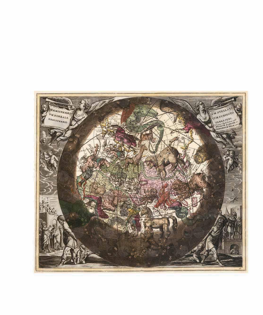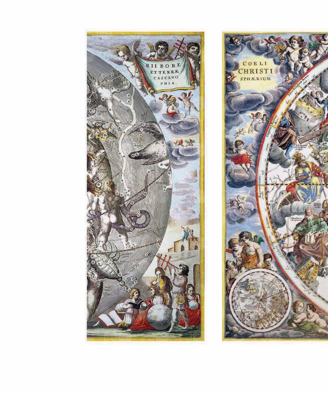 Die Ränder der Karten sind manchmal ebenso interessant wie diese selbst. Auf der linken Tafel beispielsweise betrachten Astronomen den Himmel mithilfe eines Jakobs- oder Kreuzstabs, sowohl vom Boden als auch von den Dächern nahe gelegener Gebäude aus. Der Jakobsstab war ein frühes astronomisches Instrument, das zur genauen Schätzung von Winkeln verwendet wurde. Weitere Astronomen helfen beim Aufzeichnen der Messungen, und auch ein Globus wird für die Kartierung verwendet. Aus irgendeinem Grund arbeiten die Sterngucker bei bewölktem Himmel – was natürlich nicht möglich wäre. Unterdessen hantieren die Putten in den Wolken mit eigenen Kreuzstäben.