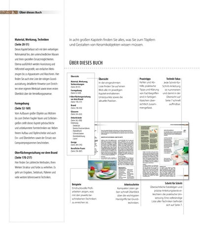 Material, Werkzeug, Vorbereitungen (Seite 20-51) Formgebung (Seite 52-169) • Aufbauen • rehen • Modellherstellung • Arbeiten mit ipsformen • Arbeitsschritte ießton Press und Eindrückformen Ein und berdrehtechnik • Kachelherstellung • Strangpressen • igitale Entwurf und erstellungs erfahren