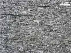 Abb. 4: Grobkörniger grauer Granit, der entlang von mylonitischen Scherzonen zu einem sehr feinkörnigen, schieferartigen Gestein deformiert wird. Grössere, helle Feldspäte sind stark ausgelängt. Strasse nach Oberaar.