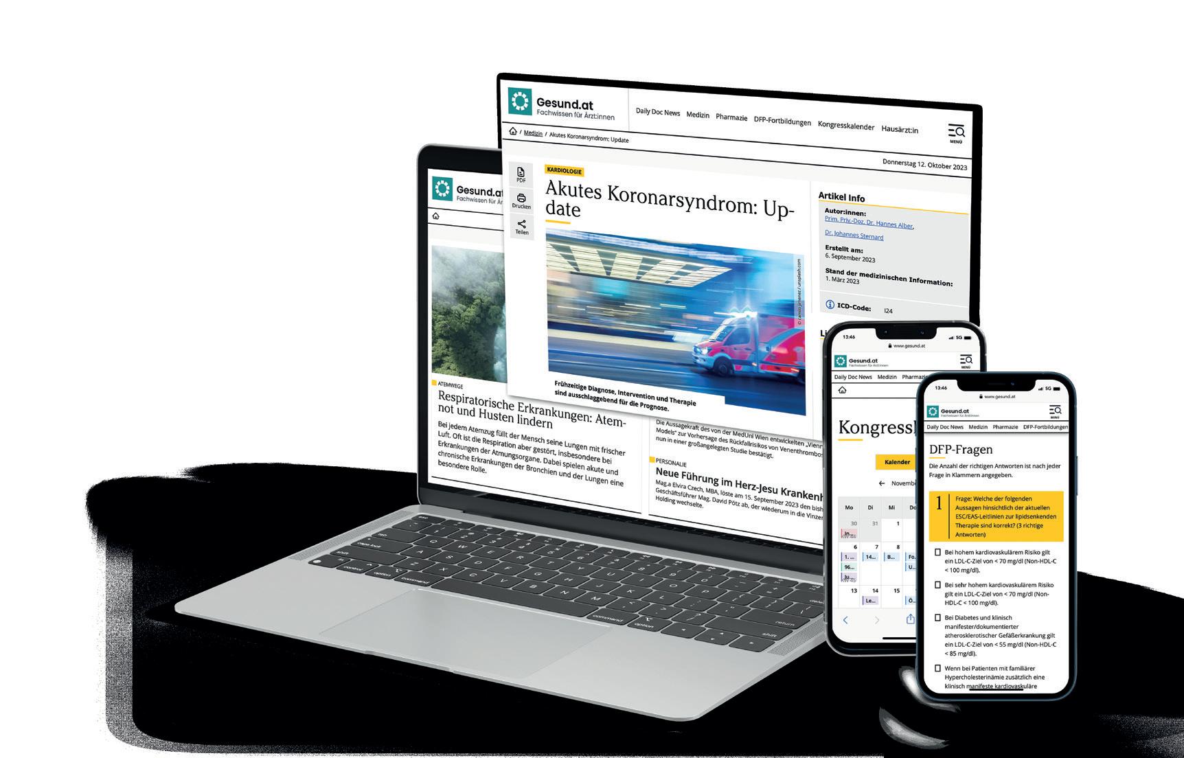 In unserem Fachmagazin setzen wir auf genderneutrale Sprache. Verwendet wird der Doppelpunkt – als beste Symbiose aus Leserlichkeit und Inklusion. Zugunsten der besseren Lesbarkeit verzichten wir teilweise auf die gänzlich orthografisch/ grammatikalisch korrekte Schreibweise. Etwa geben wir bei Artikeln und Pronomen jeweils nur eine Variante an – jene, die zur längeren Variante des gegenderten Wortes gehört. Weitere Informationen siehe: meinmed.at/kommunikation/genderneutrale-sprache/2688 issuu.com/hausarzt/docs/ha_2023_12/3 (Hausärzt:in 12/23, Editorial, S. 3) Namentlich gekennzeichnete Beiträge geben nicht unbedingt die Meinung der Redaktion oder des Verlages wieder, sondern fallen in den Verantwortungsbereich der Autor:innen. Der Inhalt von entgeltlichen Einschaltungen und Beilagen sowie die Angaben über Dosierungen und Applikationsformen liegen außerhalb der Verantwortung der Redaktion oder des Verlages und sind von der jeweiligen Anwender:in im Einzelfall auf ihre Richtigkeit zu überprüfen. Nachdruck nur mit schriftlicher Genehmigung des Verlages. Alle Rechte, insbesondere das Recht der Vervielfältigung und Verbreitung sowie der Übersetzung, vorbehalten. Kein Teil des Werkes darf in irgendeiner Form (Fotokopie, Mikrofilm oder ein anderes Verfahren) ohne schriftliche Genehmigung des Verlages reproduziert oder unter Verwendung elektronischer Systeme gespeichert, verarbeitet, vervielfältigt, verwertet oder verbreitet werden.