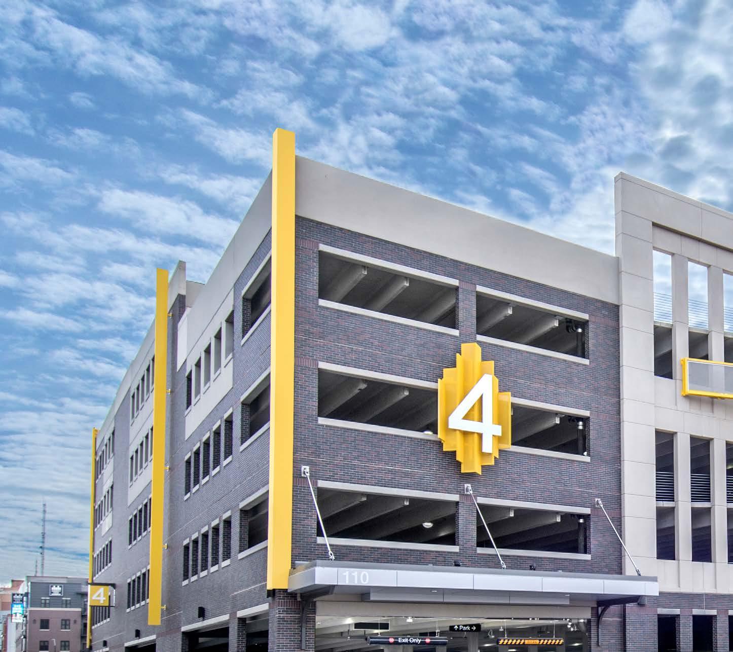 Creating a total of 654 new spaces, this 266,000 square foot parking deck combines standard public parking with private garages that connects to an adjacent housing facility.