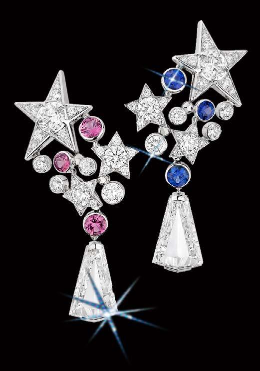 Rising Star earrings in white gold, diamonds, pink sapphires, and blue sapphires, price available upon request; available at select CHANEL boutiques nationwide and 800-550-0005