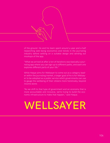of the ground. He and his team spent around a year and a half researching well-being economics and trends in the journaling industry before settling on a suitable design and sending out mockups of the app. “What we arrived at after a ton of iterations was basically a journaling app where you can sign up to different paths, and each one explores different parts of your life.” While Haque aims for Wellsayer to come out as a category leader within the journaling market, a larger goal of his is for Wellsayer to be adopted as a public service which governments can use to gauge the wellbeing of their citizens more holistically, beyond income alone. “As we shift to that type of government and an economy that is more accountable and inclusive, we’re trying to build the economic infrastructure to make that happen,” said Haque.