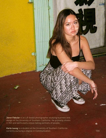 Jaron Fabular is an LA-based photographer studying business and design at the University of Southern California. He primarily shoots in film and particularly enjoys taking portraits of people. Karla Leung is a student at the University of Southern California currently pursuing a degree in Communication.