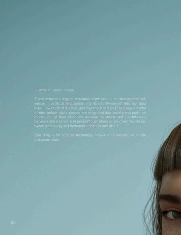 — after all, she’s not real. There remains a tinge of dystopian aftertaste in the discussion of advances in artificial intelligence and its intertwinement into our daily lives. How much of it is real, and how much of it isn’t? Is it only a matter of time before digital people are integrated into society and push real models out of their jobs? Will we even be able to tell the difference between real and non-real people? Just where do we draw the line between technology and humanity, if there is one at all? One thing is for sure: as technology innovation advances, so do our Instagram stars.