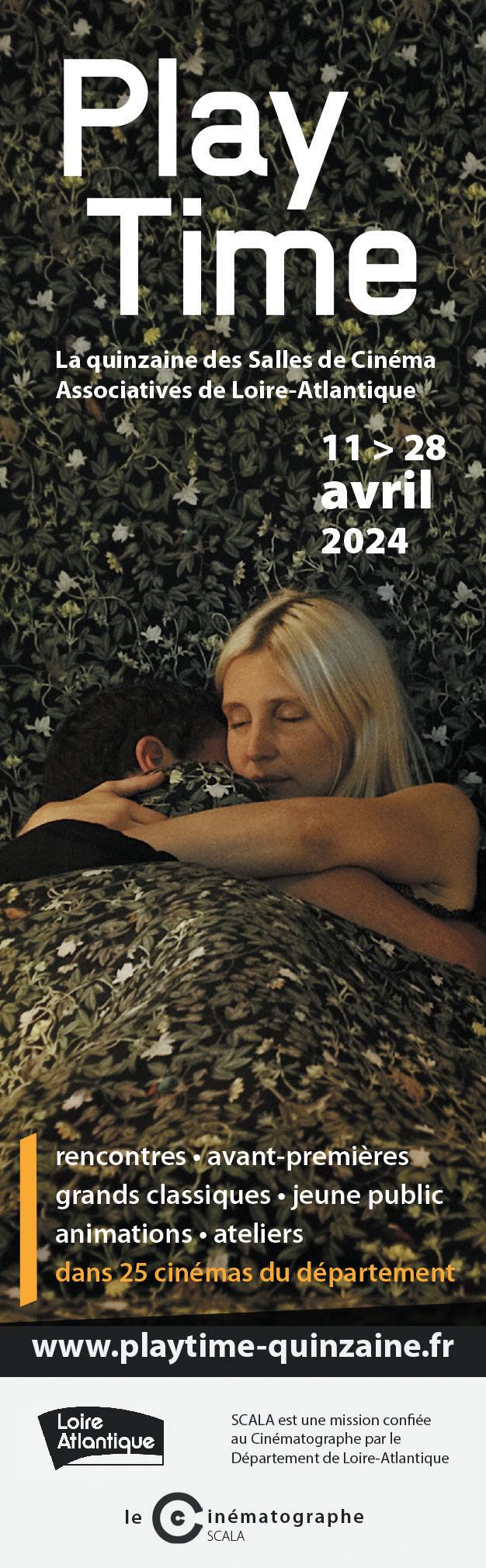 Le Cinématographe coordonne la 9e édition de PlayTime, la Quinzaine des Salles de Cinémas Associatives de Loire-Atlantique (SCALA). L’occasion pour tous les publics de découvrir ou de redécouvrir des films en salle, au cours de multiples rencontres, près de chez vous. Du 11 au 28 avril, dans les cinémas associatifs de Loire-Atlantique - www.playtime-quinzaine.fr