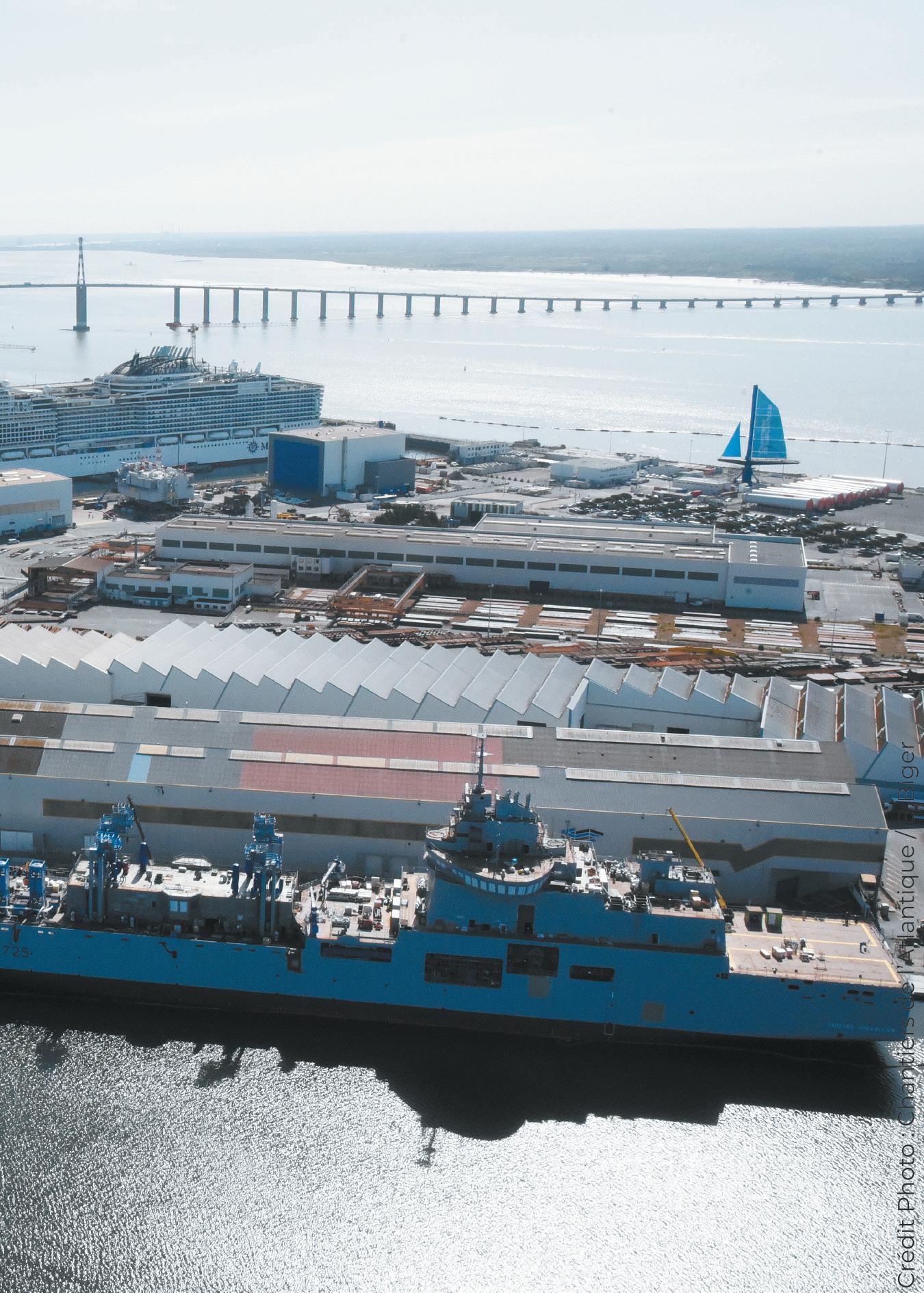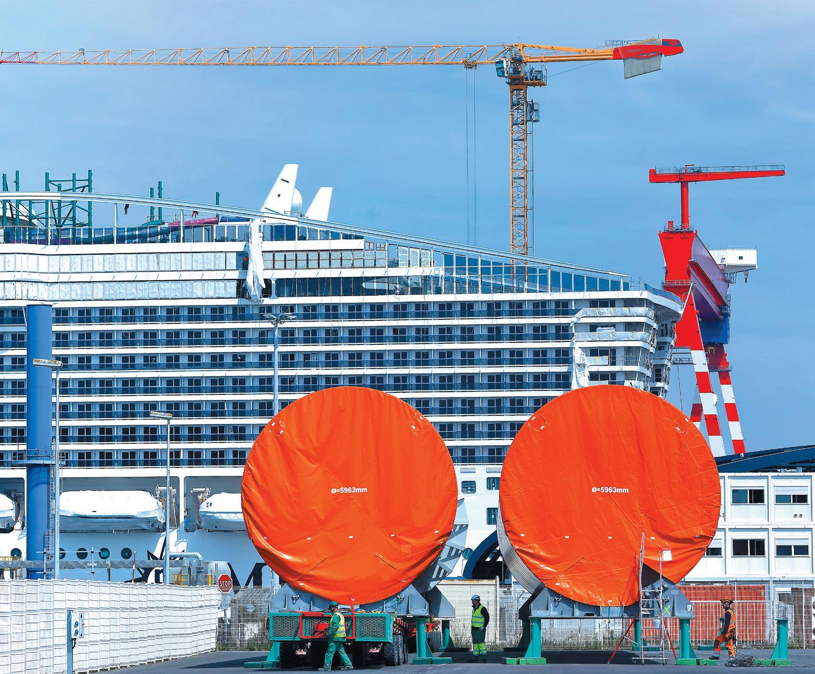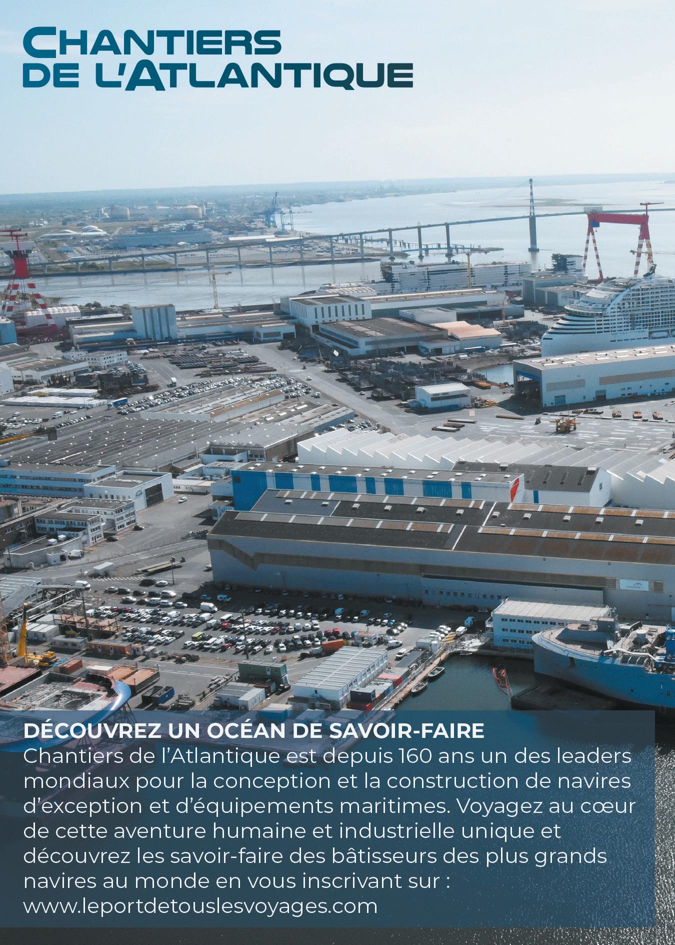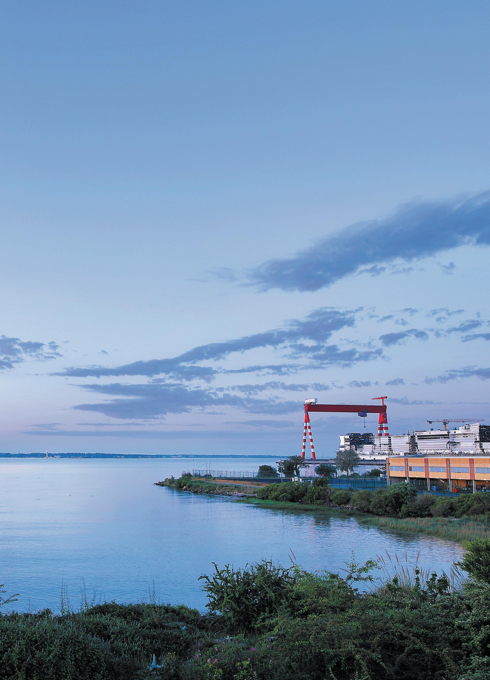 Une image d'édito avec un paysage super graphique et qui met en valeur des grandeurs présentes dans l'ADN de Saint-Nazaire. Un paquebot qui termine de s'habiller. Les tranches orangées d'éoliennes en attente d'assemblage. Manque juste un avion pour y voir toute la collection de ses impressionnantes productions dont les reflets évoquent les grands changements de notre société et du monde.