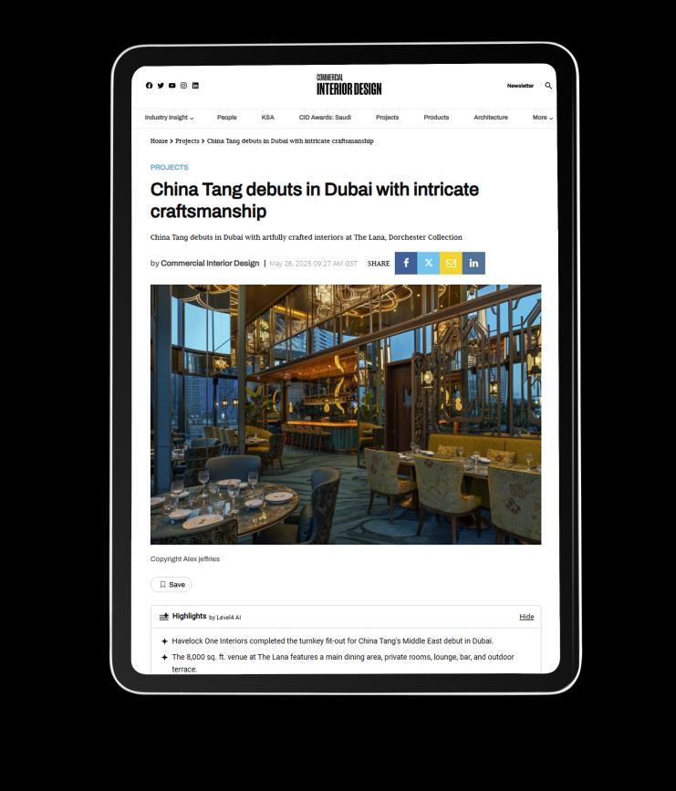 “It has been an absolute pleasure working with Havelock One on the successful delivery of China Tang, Dubai. We couldn't be more impressed with the team’s unwavering commitment to quality, health and safety, professionalism and seamless execution.