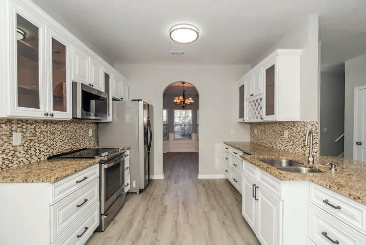 The culinary heart of this home is a chef’s delight, featuring a sprawling open kitchen adorned with pristine granite countertops, top-ofthe-line stainless steel appliances, and a stylish tile backsplash, all seamlessly flowing into the living space for the ultimate entertainment experience.