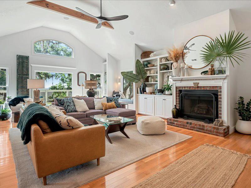 Welcome to a coastal sanctuary where timeless Southern charm blends with the tranquility of nature. The grand oaks, adorned with Spanish moss, whisper tales of the South as you follow the curving driveway to a pristine white home that beckons with the promise of warmth and comfort. As you cross the threshold, the home unfurls its welcoming arms with an entryway that combines rustic elegance and coastal motifs, setting the tone for a residence that feels both refined and inviting. The heart of the home is undeniably the living area, with plush seating arranged around a classic brick fireplace, creating an inviting ambiance to gather. Step outside to the screened porch, a seamless extension of the home that embodies the indoor-outdoor lifestyle. This is a space where conversations and leisure intermingle with the gentle breezes and sounds of the surrounding landscape, emphasizing the home's unity with nature. In essence, this isn't merely a house—it's a vessel for life's cherished moments.