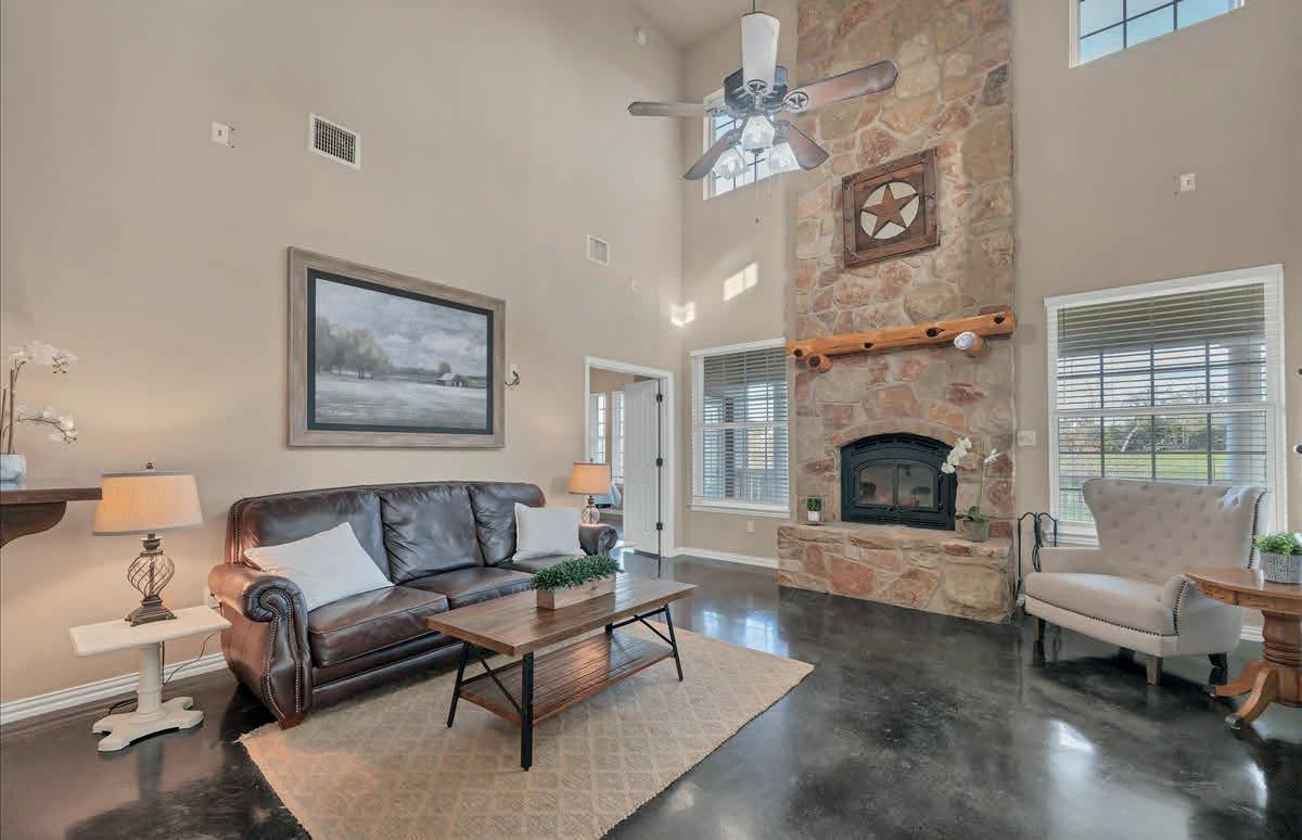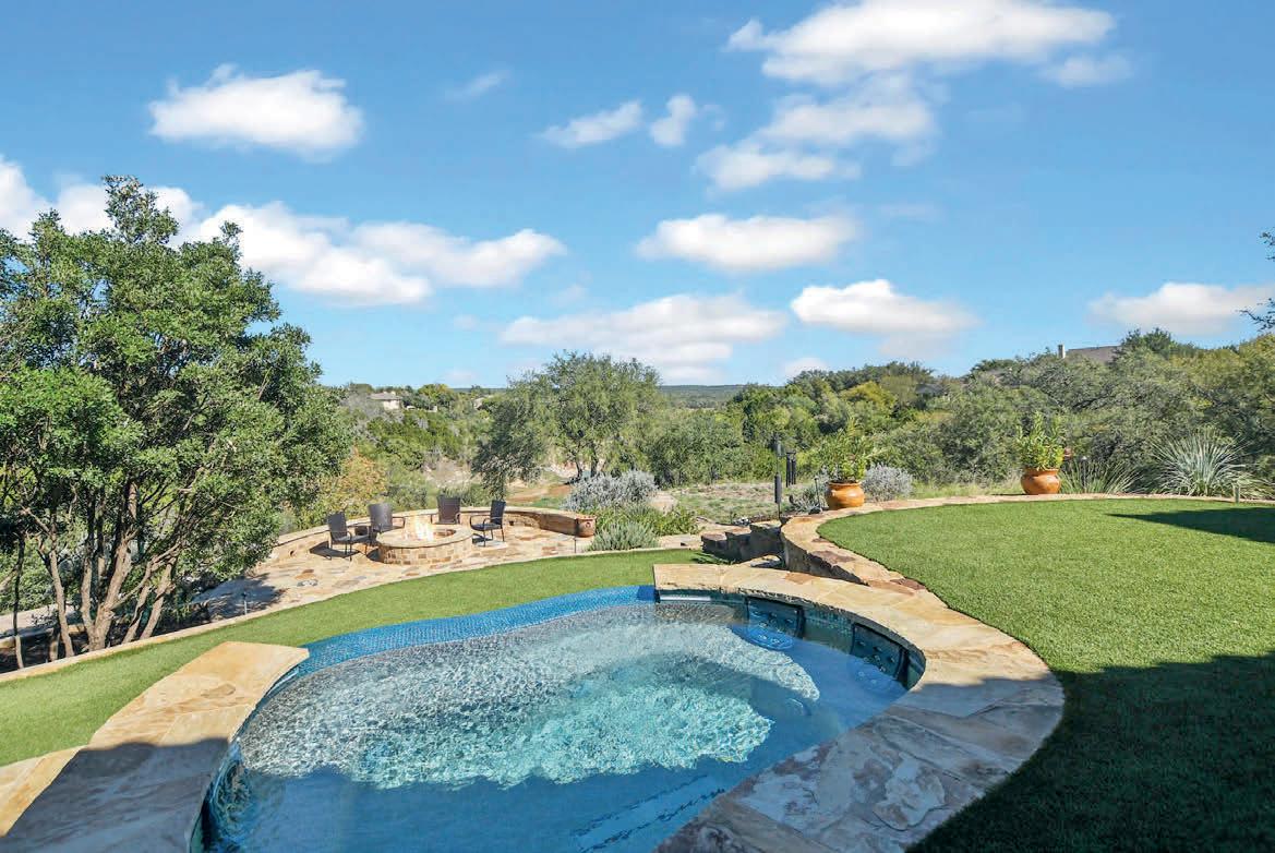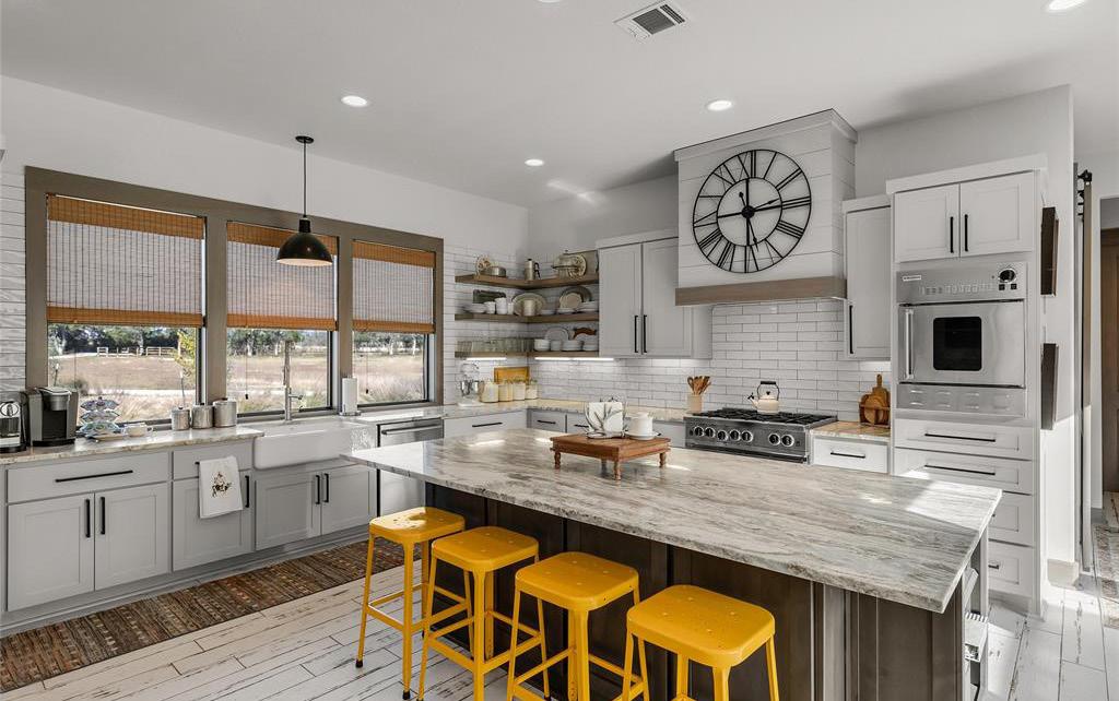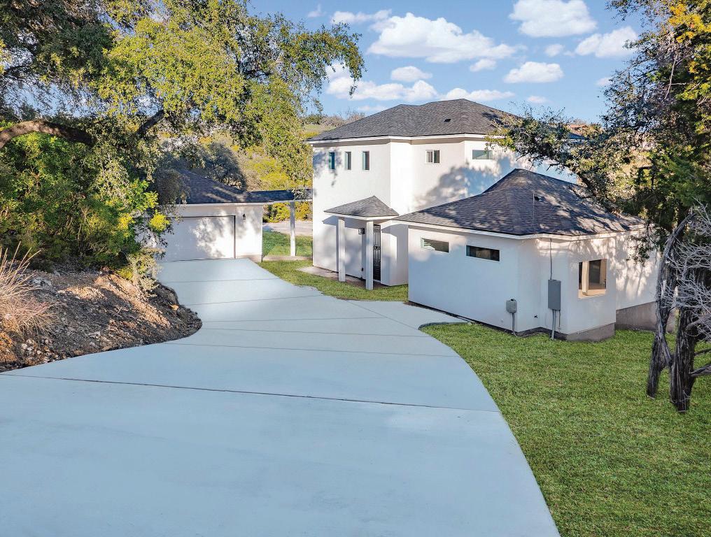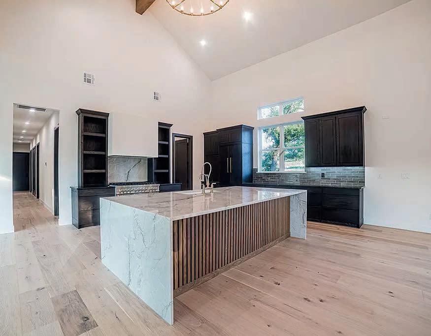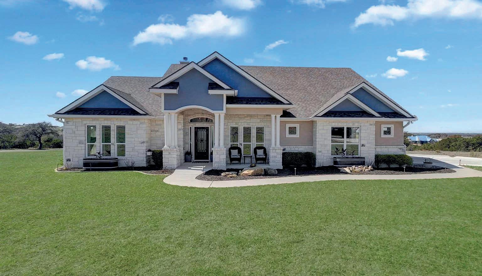 5 BEDS | 5.5 BATHS | 4,994 SQ FT | $2,697,770 | Located in the gated community of Clearwater Landing at Lake LBJ, this newly constructed residence is the ultimate dream home for those insisting on the finest in design and craftsmanship. This hill country contemporary home is graced by a bright and open floorplan featuring wide plank White Oak hardwood floors and is filled with warm, sophisticated furnishings and décor. The captivating two-story foyer, with its cascading chandelier and curved staircase, draws you into a layout made for entertaining. Fluted wall panels anchored by a linear fireplace define the 20’ ceiling in the great room, lit by a dramatic pendant chandelier and natural light that spills in from the 12-foot glass sliding doors. The gourmet kitchen with custom cabinetry and large center island features quartz countertops and professional-grade appliances duplicated in the adjacent prep kitchen. The primary suite presents opulent amenities such as a coffee bar, a retractable projector screen, surround sound, and a fireplace. The second floor hosts all guest suites, a bonus prayer room, a workout room, and a state-of-the-art home theater. The indoor luxury extends outside to the living and dining spaces, where a fully equipped summer kitchen boasts a gas grill, wood-fired pizza oven, wine refrigerator, drawer fridge & freezer, dishwasher and sink. Enjoy Lake LBJ access without paying waterfront prices, as your separately leased boat slip is waiting at the Clearwater Marina, located just 1 minute away.